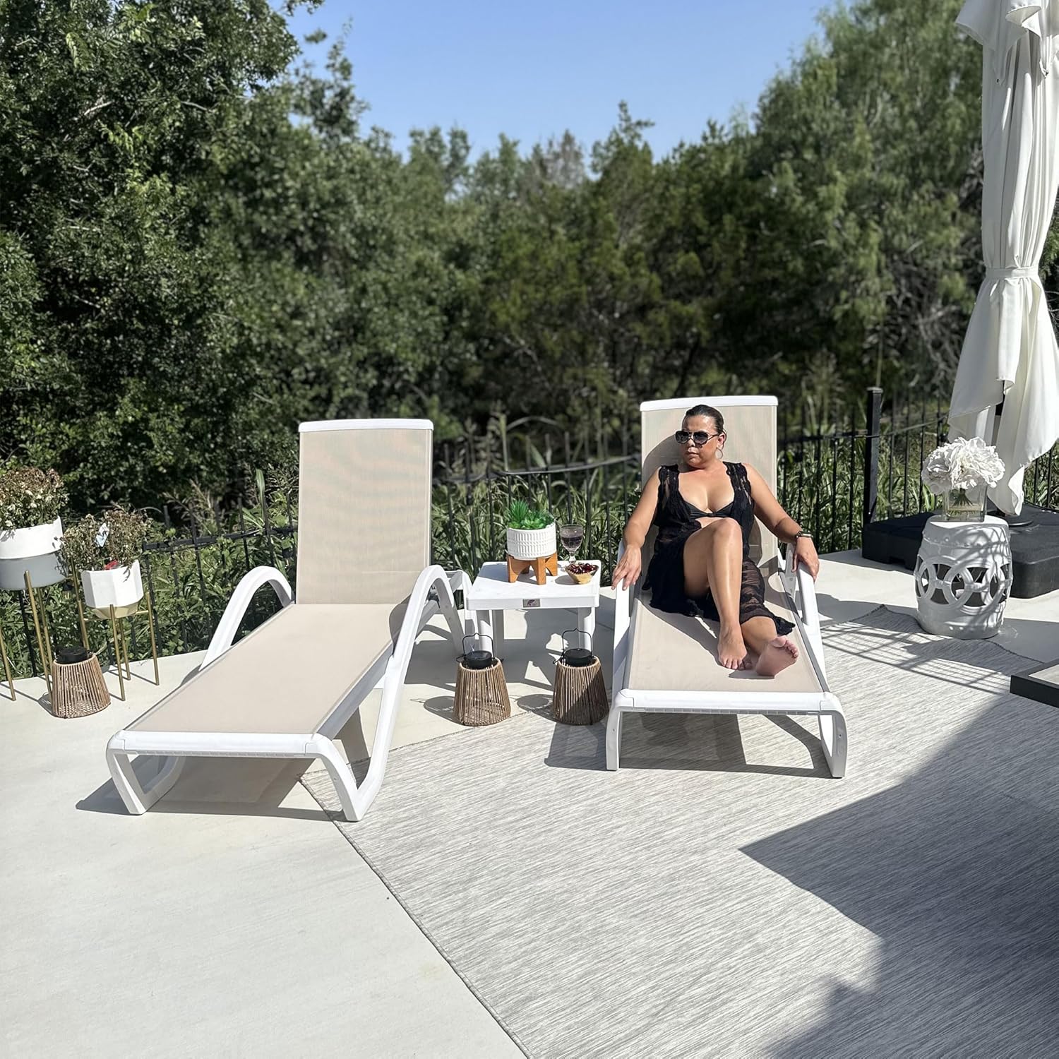 - Packages include 2 chaise lounge chairs and 1 side table.