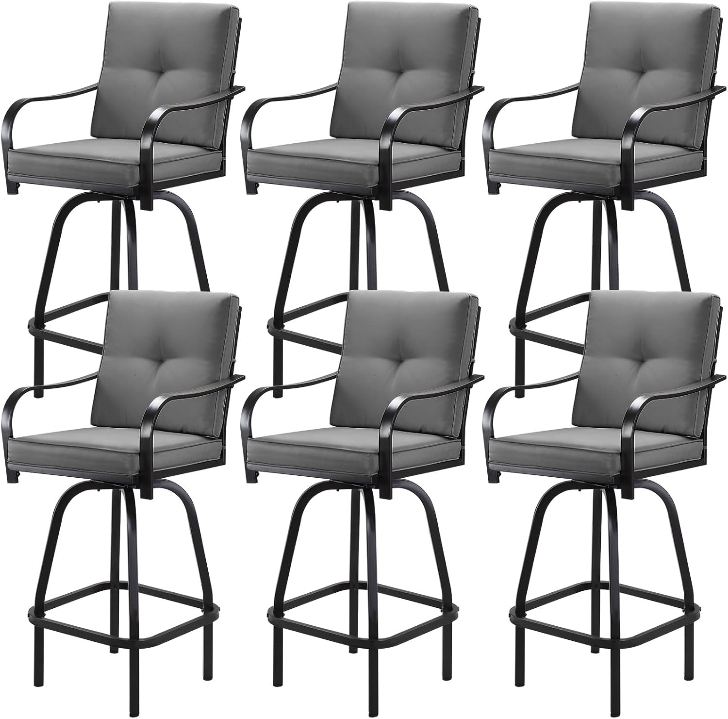 Patio Swivel Bar Stools Set of 6, Outdoor Bar Height Patio Swivel Chairs with Cushion for Garden Balcony Backyard (Grey)