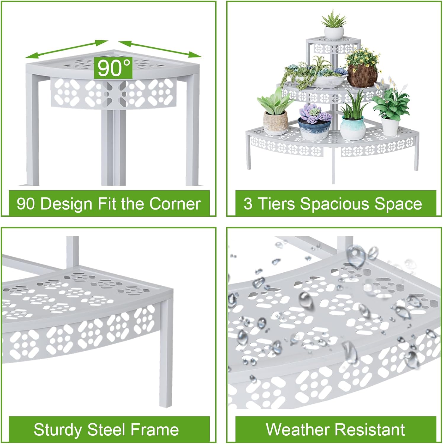 - 【3 Tiers Corner Shelf】This plant rack features 3 tiers to showcase your beautiful flowers, succulent collection, yard decorations, garden tools, and so on. 90° design is saving space and ideal for placing it in the corner.This kind of plant rack can accommodate 6 to 8 medium-sized potted plants in total, and the bottom layer can hold 3 to 4 medium-sized potted plants.The load-bearing capacity of each floor is approximately 50 pounds.