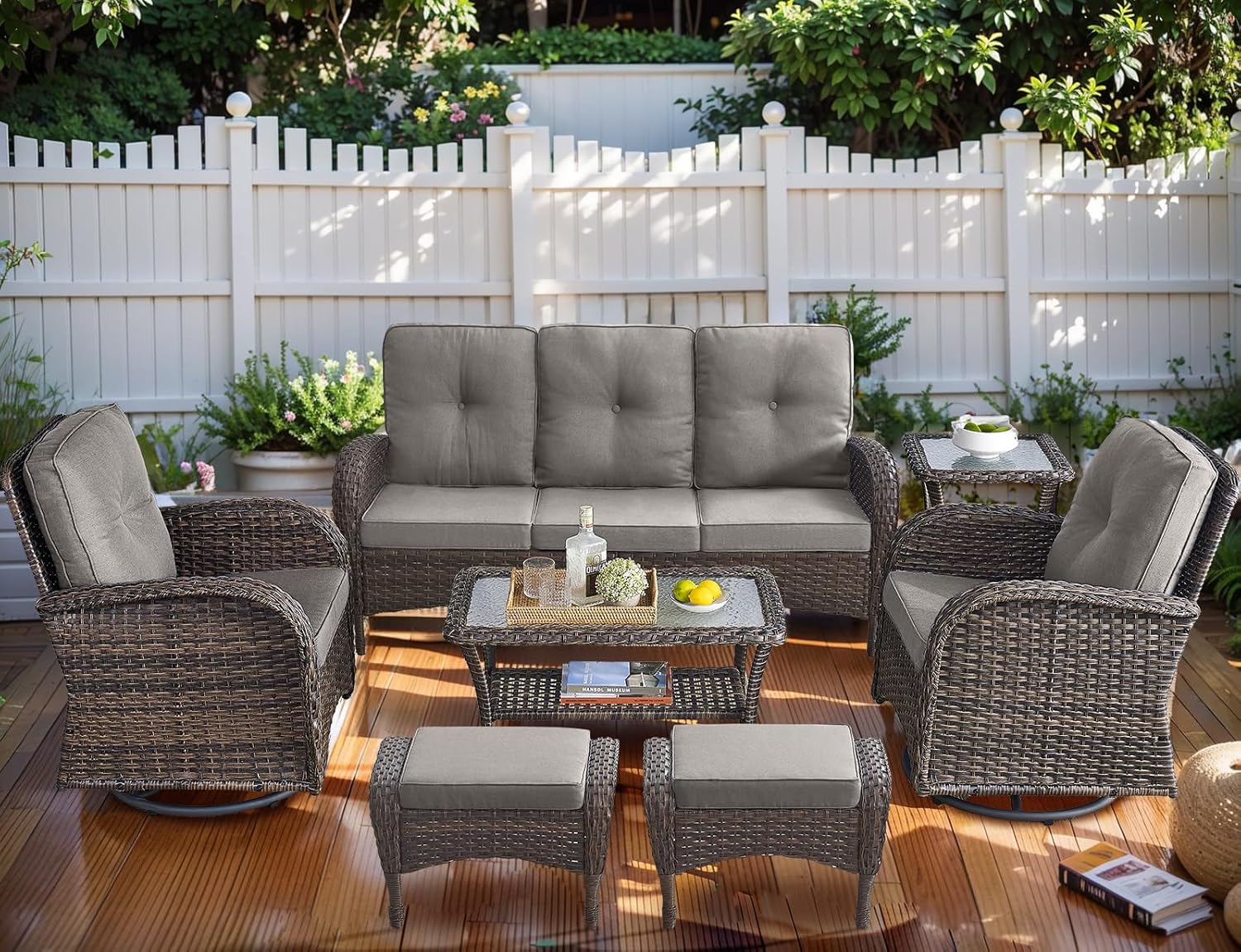HUMMUH 7-Piece Outdoor Patio Furniture All-Weather PE Wicker Outdoor Conversation Set-Patio Couch Swivel Rocker Chairs with Ottomans Tables for Backyard,Poolside,Deck
