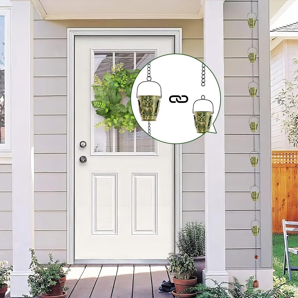 - Elegant Alternatives: The rain chain consists of 12 retro green cups, each cup has 4 owl decor.The length is suitable for standard single-story buildings. The vintage look adds a chic touch to roofs and awning dens. An elegant alternative to traditional gutter downspouts