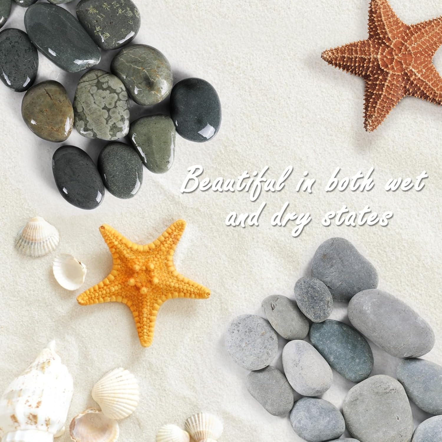 - 【Different Presentations】Ausluru smooth decorative pebbles have different presentations in different conditions. They are slightly dull when dry, nevertheless, the color of the wet stone is more light and beautiful.
