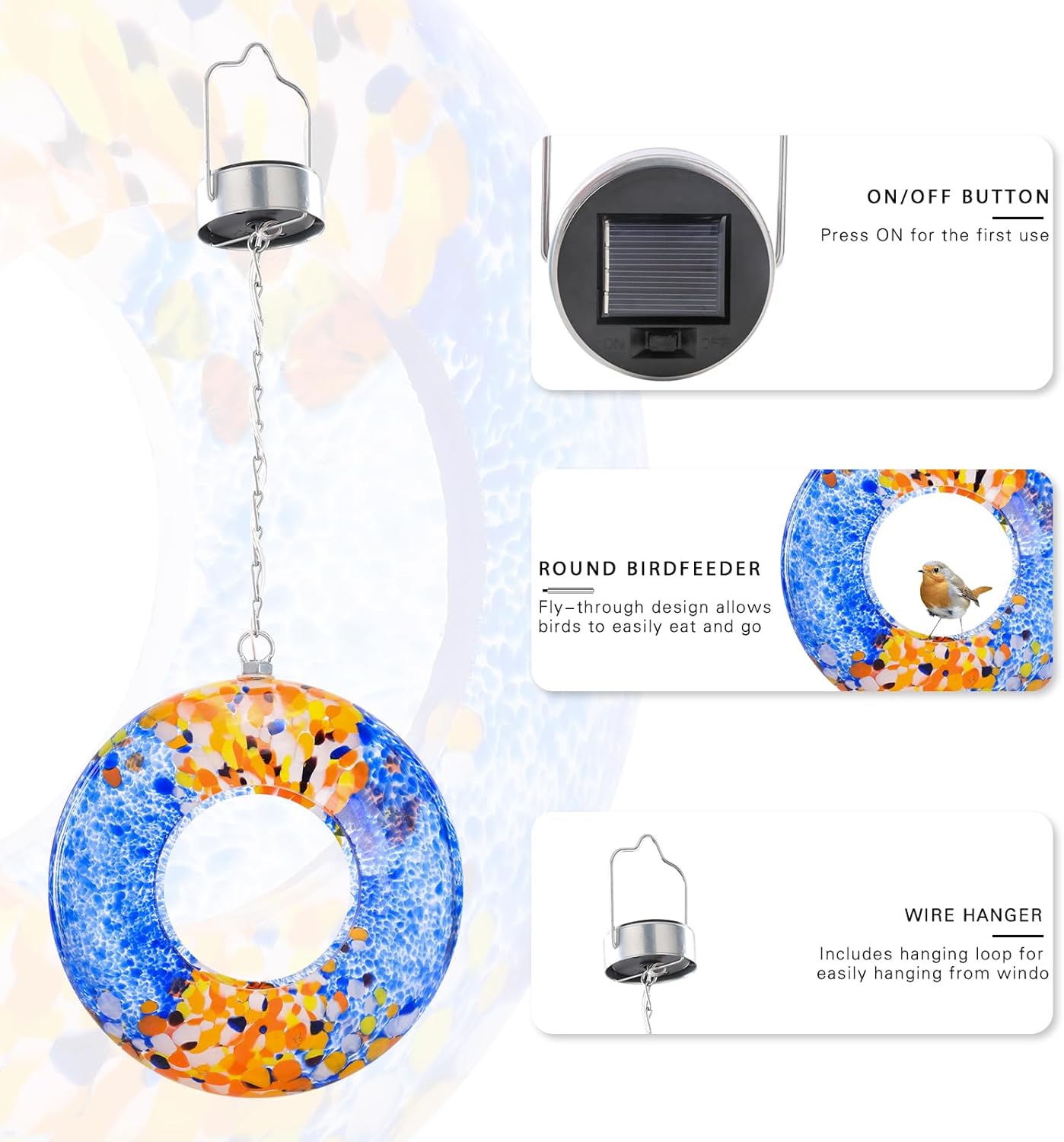 VCUTEKA Bird Feeder Solar Fly Through Bird Feeders for Outside Hanging with Round Shape Glass Container to Attract Wild Birds for Garden Decor, Solar Birdfeeder as Gift for Lovers, Multi 8-Inch