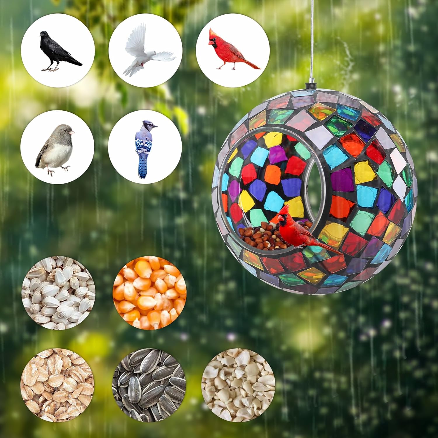 - Mosaic Bird Feeder: Has a colorful mosaic glass design which reflects beautiful lights in the sun and attracts birds to feed, making your home and garden more lively