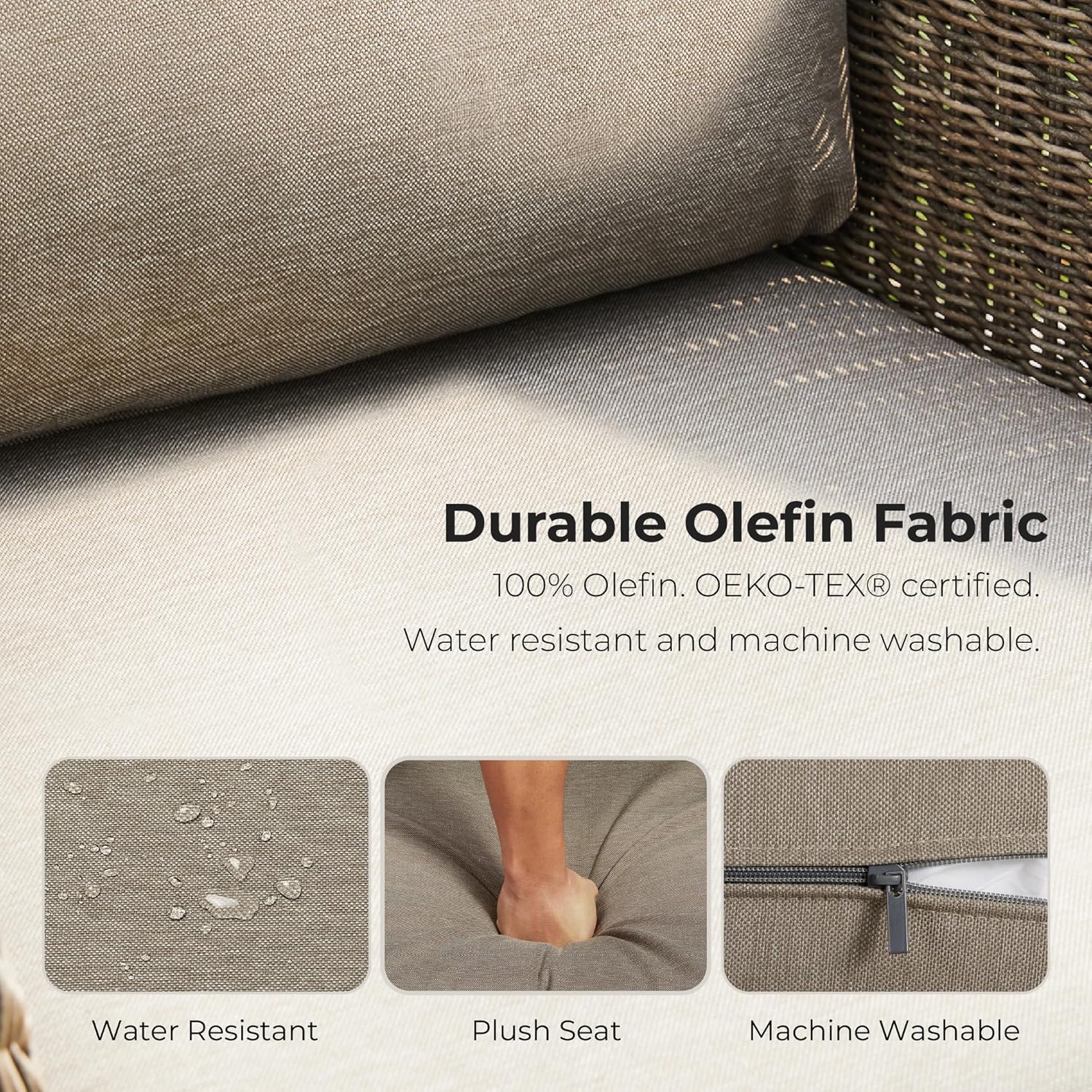 - Easy to Clean - The water-resistant 100% Olefin cushion covers are easy to maintain. Simply spot clean with mild soap and water for regular care, or machine wash on a cold cycle for deeper cleaning. For protection during harsh weather, store the cushions under cover temporarily.