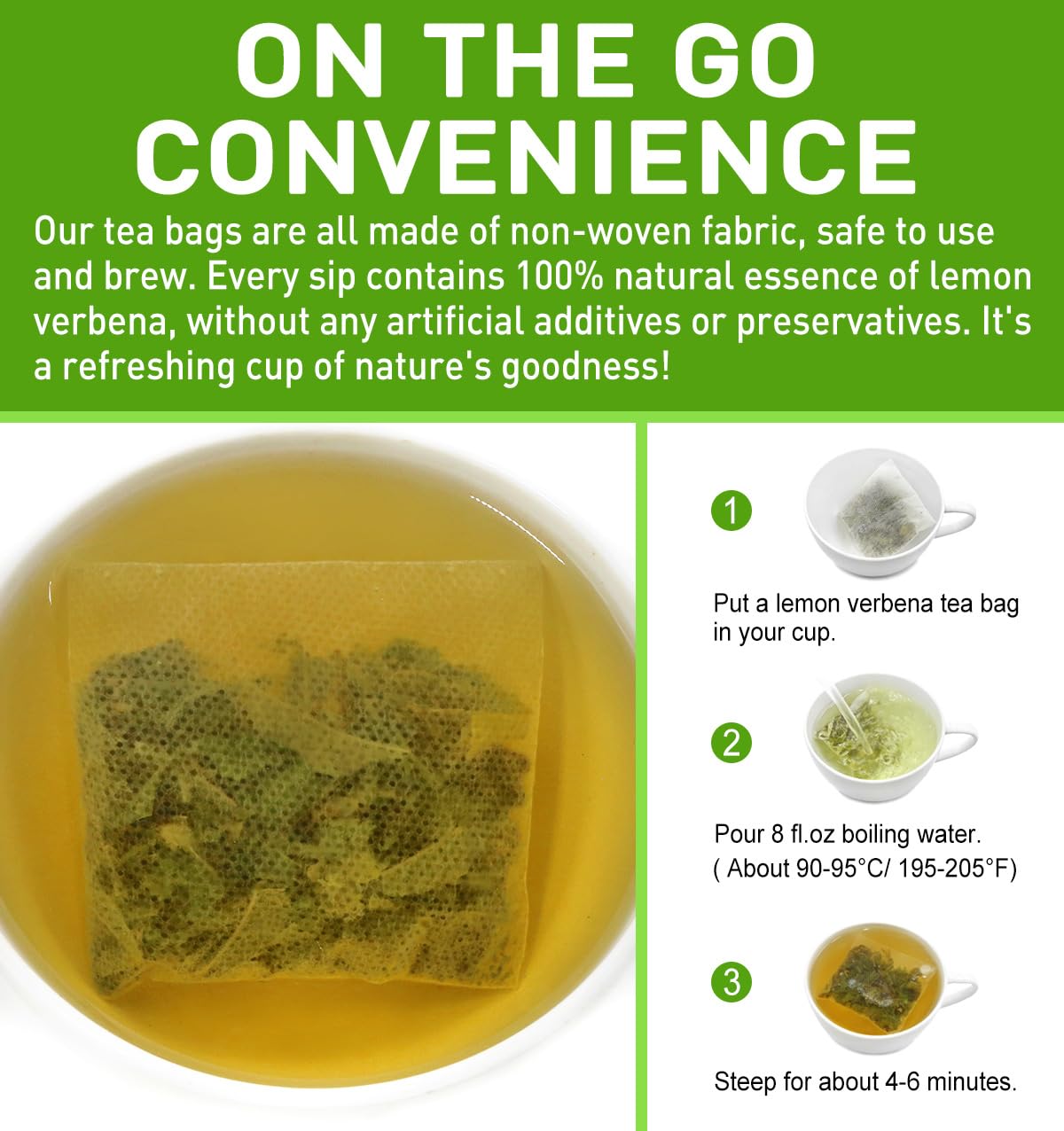 - EASY TO USE: 30 lemon verbena tea bags are placed in a resealable bag to keep them fresh. Just take one and place it in the cup, add 8 fl.oz of boiling water. Steep for about 4-6 minutes. Take out the tea bag then enjoy this lemon tea;