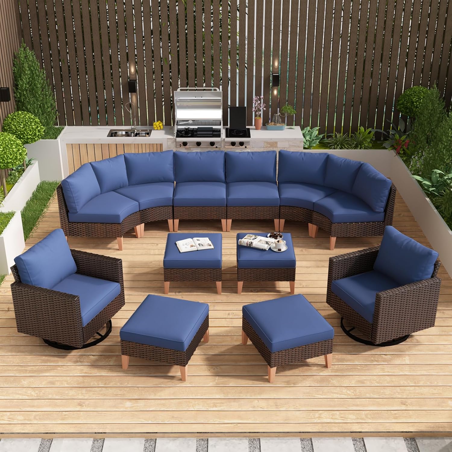 HUMMUH 12 Pieces Patio Furniture Set,Outdoor Half-Moon Sectional Couches Swivel Patio Chairs with Ottomans,All Weather PE Wicker Patio Conversation Sets for Garden Porch Backyard