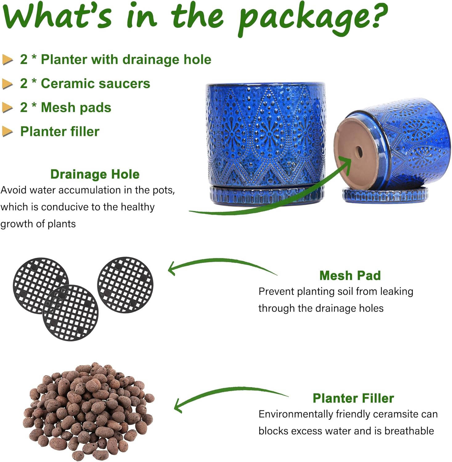 - Size & Package : 8 Inches + 6 Inched plant pot. Package: contains 2 ceramic flower pots, 2 ceramic saucers and 2 mesh pads(NOT INCLUDE PLANTS)