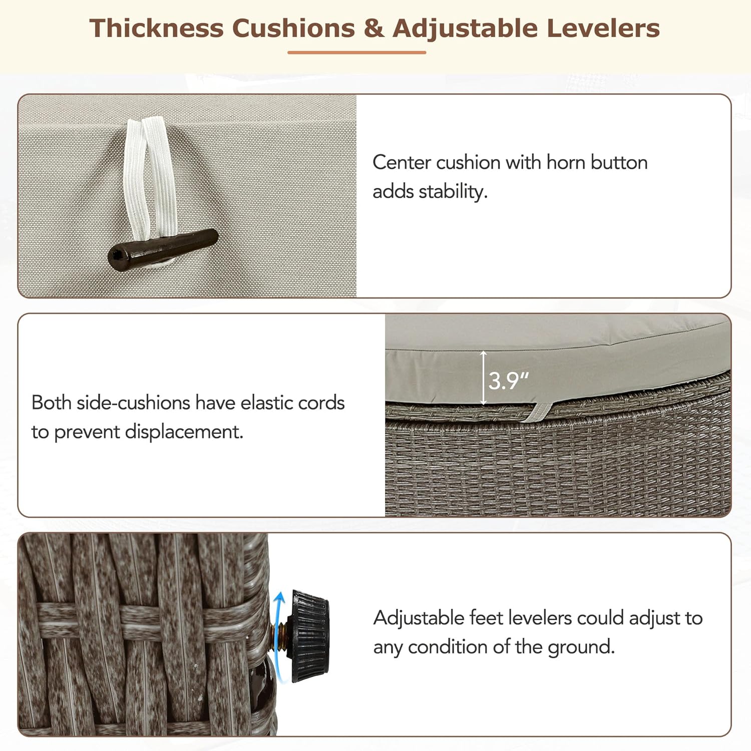 - š Thickness Cushions: The backs of the cushions on both sides are attached to the rattan frame with elastic cords to prevent displacement during use. Horn buttons are incorporated into the cushions at the center section for added stability, ensuring that the cushions stay firmly in place. Adjustable feet levelers could adjust to any condition of the ground.