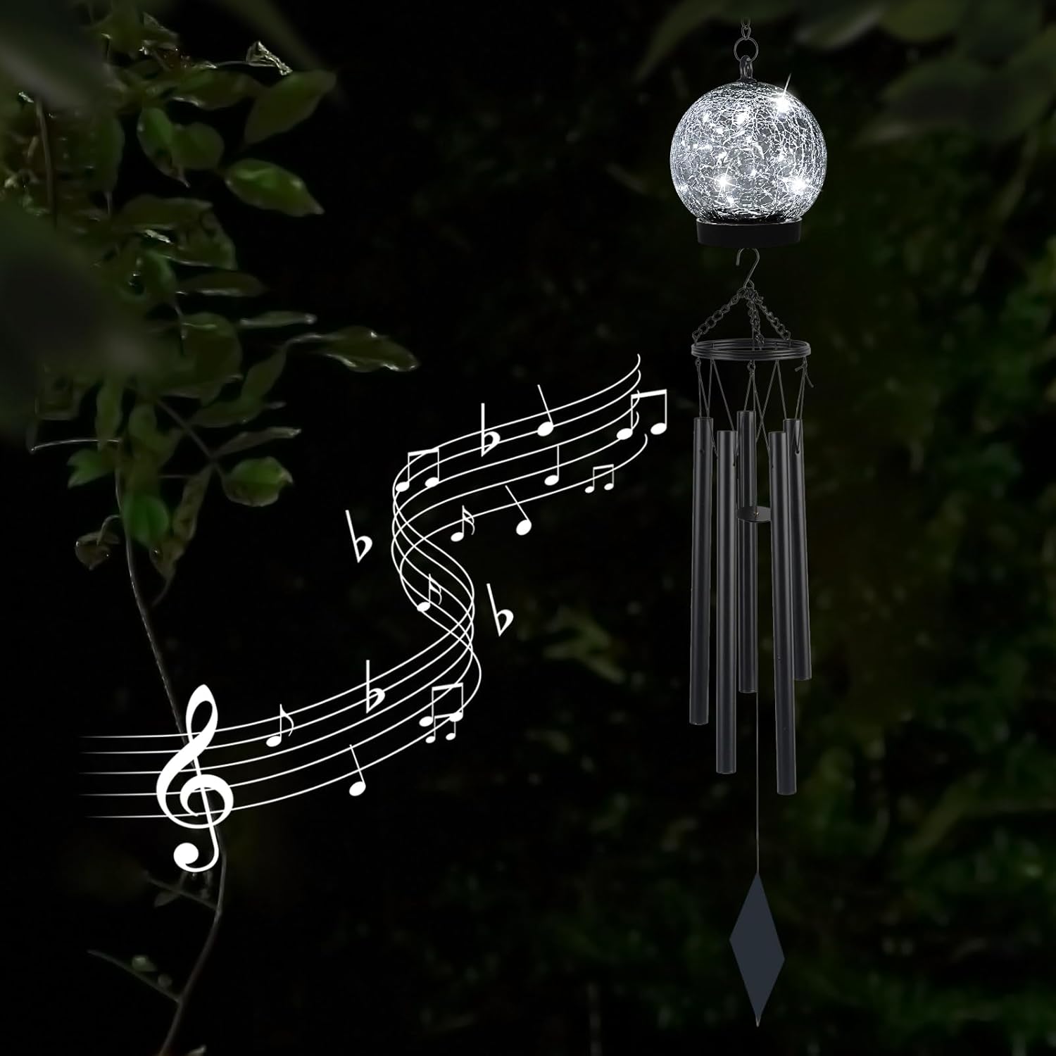 - 【Pretty Garden Décor】: The unique solar wind chimes are designed to add a refreshing and stylish touch to your outdoor. The hanging cracked glass lantern is like a beautiful crystal ball, providing cool white light and a romantic atmosphere for your yard. It is not only a hanging wind chime for outside but also a solar garden light decor.