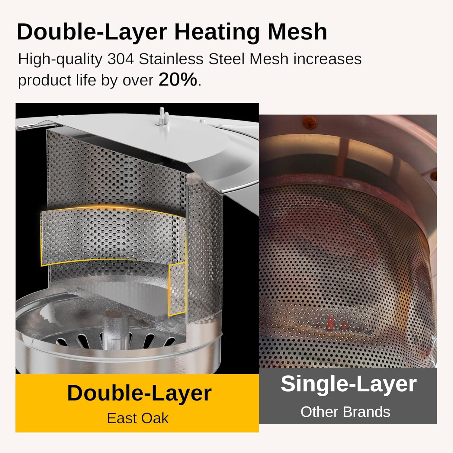 - š š¼šæš² šššæš®šÆš¹š² šš¼ššÆš¹š²-Lš®šš²šæ šš²š®šš¶š»š“ š š²ššµ: High-quality 304 stainless steel is engineered into our double-cover heating mesh design. Compared with a traditional single-layer burning mesh heater, the EAST OAK Outdoor Heater is more powerful, durable, and safer. All these improvements deliver a 30% longer product life