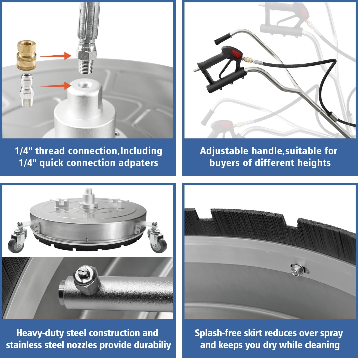 - PREMIUM QUALITY - Constructed with durable stainless-steel material and equipped with a heavy-duty bearing system, this cleaner ensures long-lasting performance. The splash-free skirt effectively minimizes overspray for a dry-cleaning experience. With adjustable dual-handles and 4 castors, it is easy to use and maneuver, saving you effort.