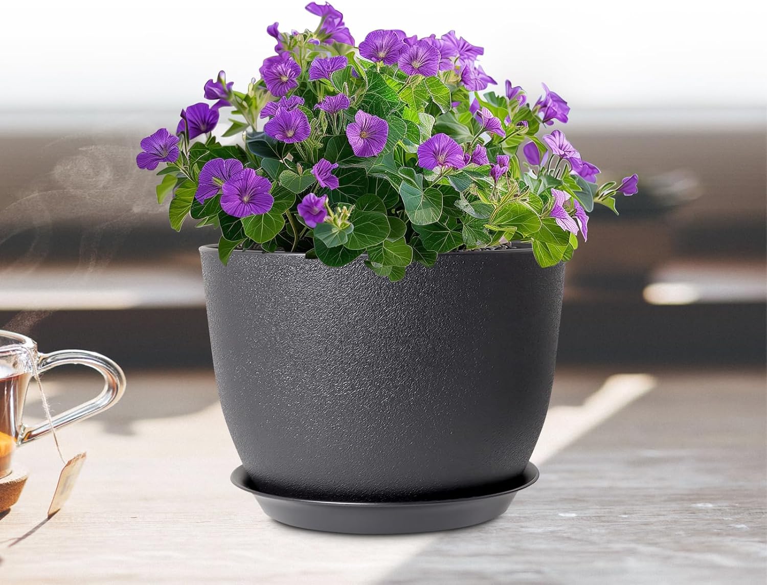 12 inch Large Plant Pots, Plastic Planters with Drainage Holes and Saucers, Flower Pots for Indoor Outdoor Plants, Modern Decorative Pots for Garden House Plants, Black