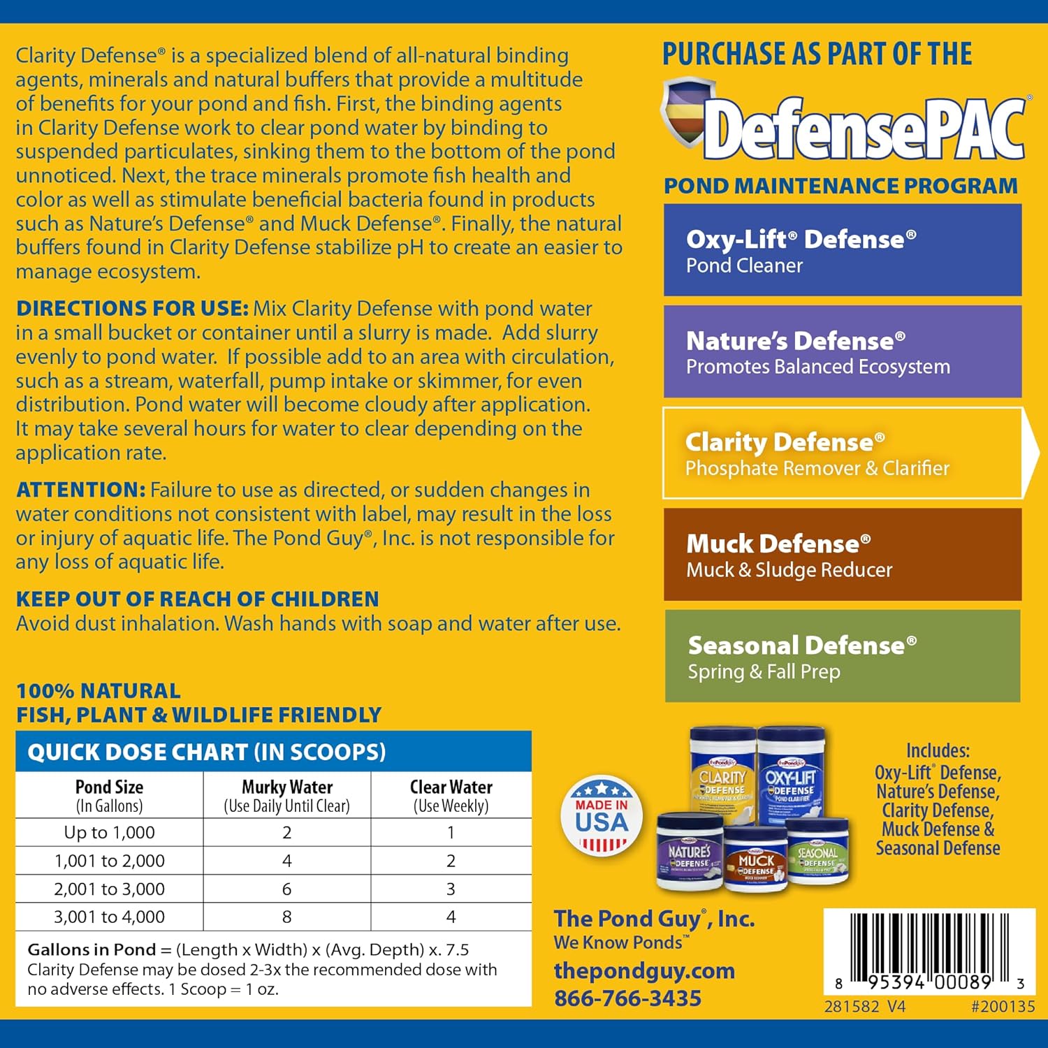 - Easy to Use Pond Maintenance -- When used regularly, Clarity Defense helps maintain crystal clear pond water all season. All natural and safe for animals, fish, pets, plants, and the environment.