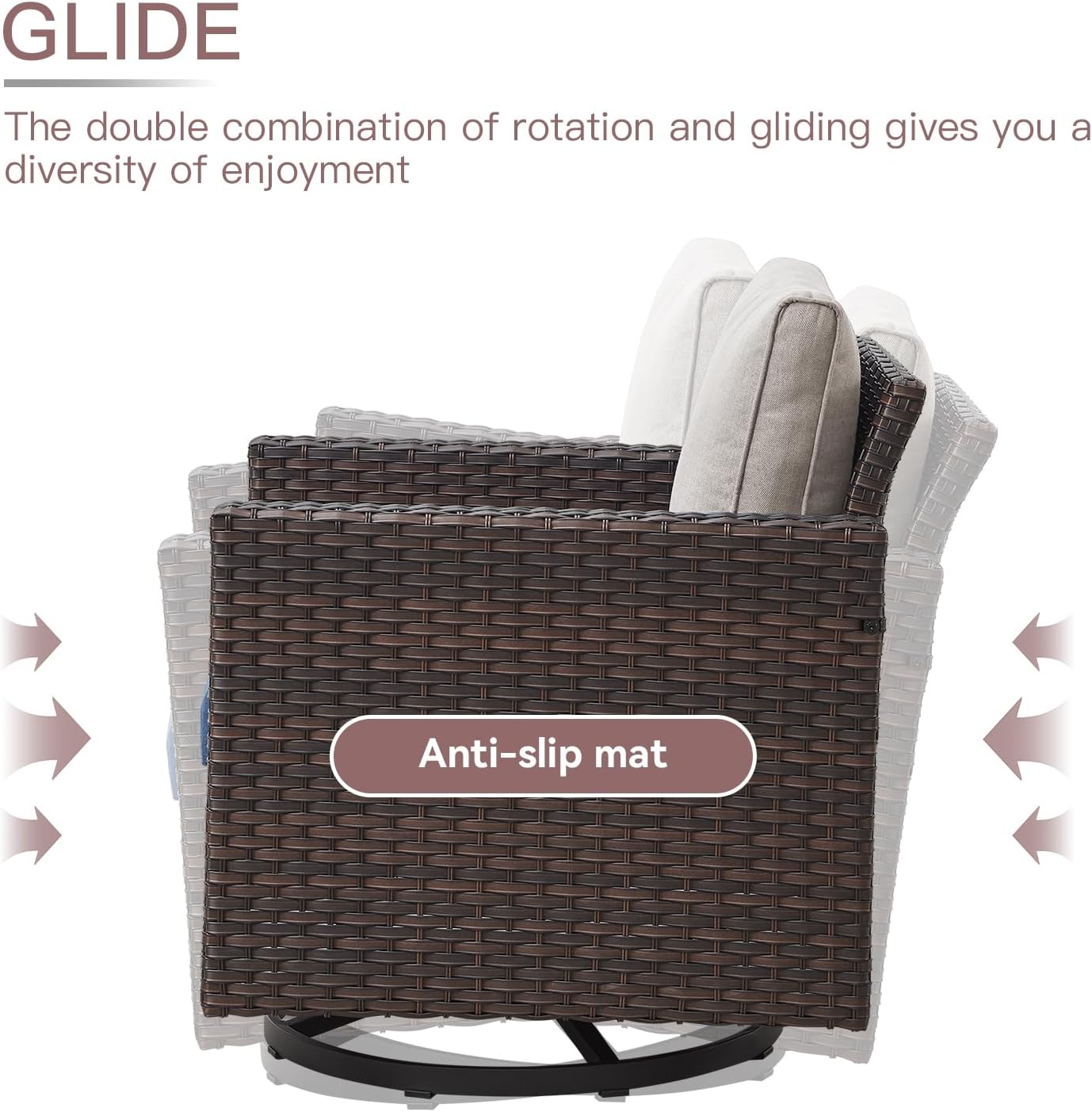 - 360ยฐSwivel Glider Rocker Chairs: Design of rotating 360 degree,swinging back and forth,You can easily turn your face away from the sun without moving the entire chair, or swing your seat like a cradle for the ultimate relaxation while listening to music or watching your children play outside.