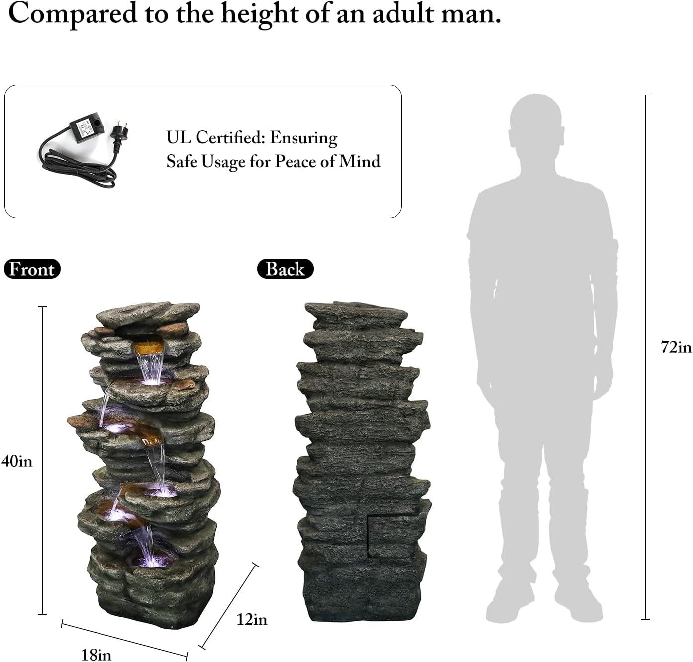 SunJet 40" High 6-Tiers Cascading Rock Outdoor Water Fountain with LED Lights - Large Outdoor Fountains and Waterfalls for Garden or Patio, Yard, and Deck Decor, Featuring Natural Stone Look