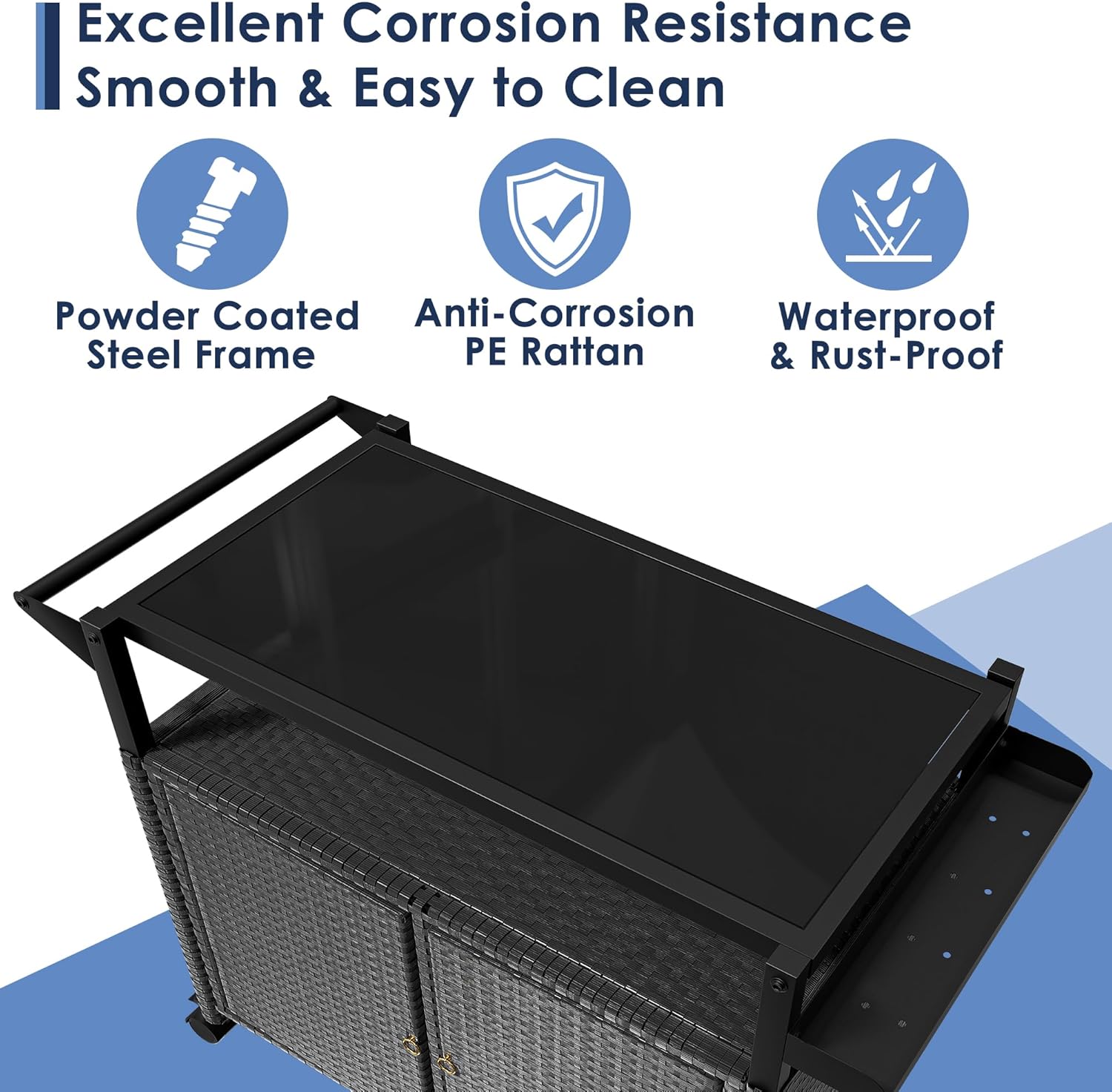 - 【Modern Patio Bar Cart】Featuring a 5mm black tempered glass top and an enclosed wicker storage cabinet, this outdoor bar cart seamlessly blends beauty with practicality, making it a must-have for your poolside, patio, or outdoor kitchen. Total 74 gallons storage capacity (54 gallons enclosed cabinet + 20 gallons open shelf), it offers ample space for all your outdoor essentials