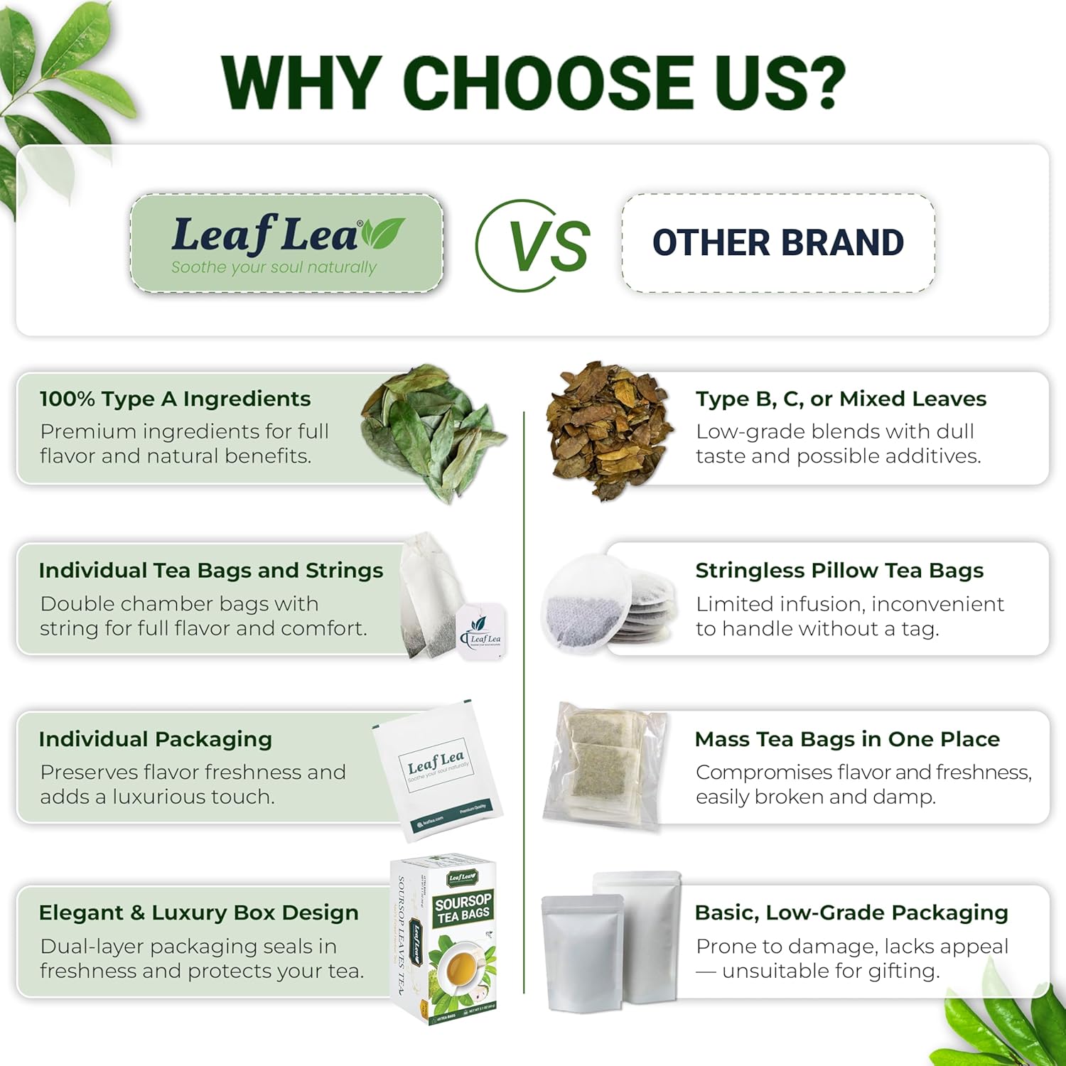 LeafLea 80 Soursop Leaf Tea Bags, from Natural Soursop Leaves (Graviola), Herbal Blend for Wellness, Sour Sop Herbal Tea Individually Wrapped for Freshness, Caffeine-Free, Vegan, No Sugar, Non-GMO