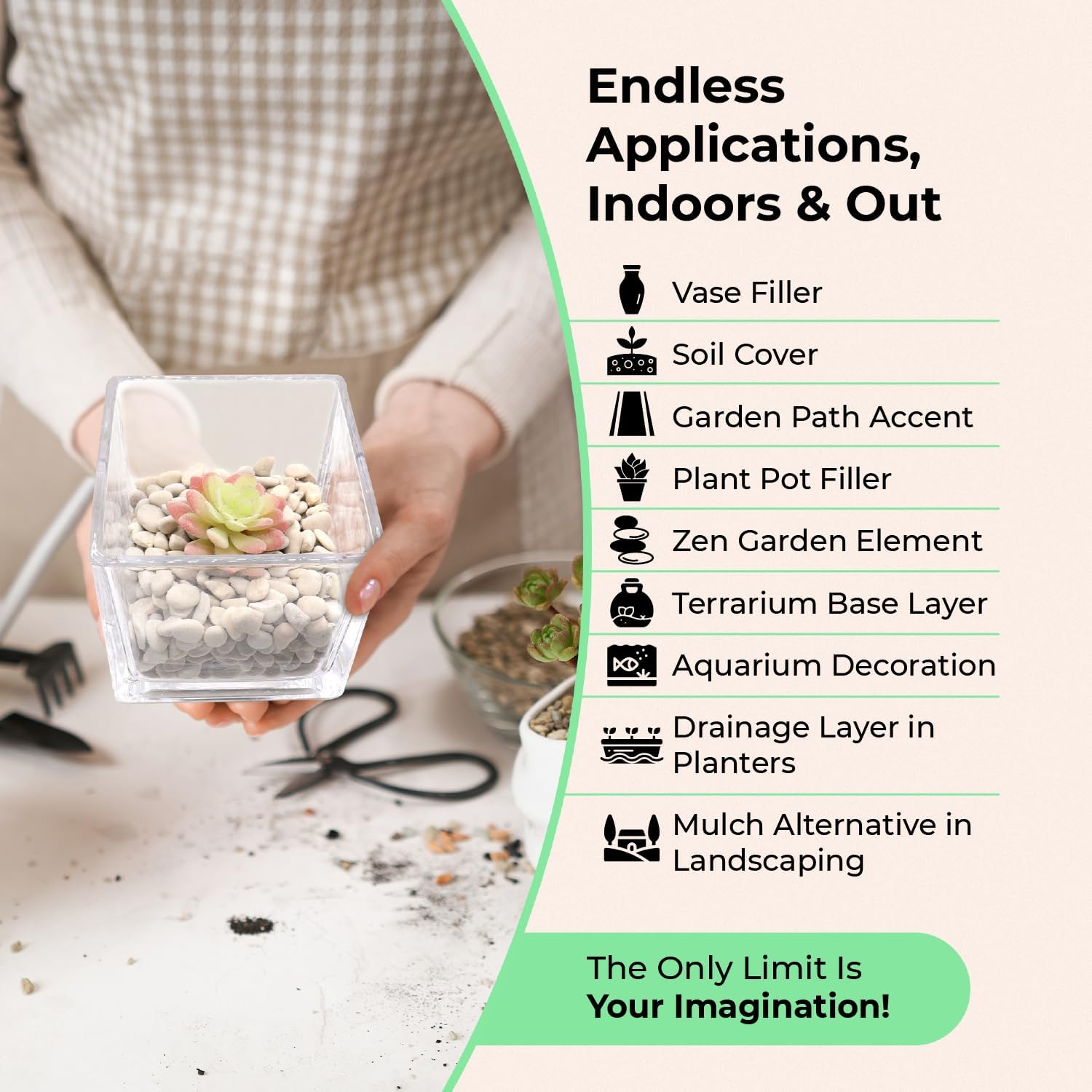 - Styles for Use Indoors and Outdoors: We've got the perfect pebble for every project: coarse decorative sand, small rocks for plants, aquarium gravel, landscape rocks, garden stones, pot filler, pebbles for vases, soil cover, and more
