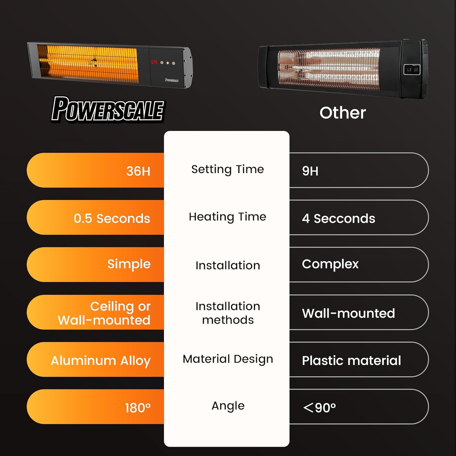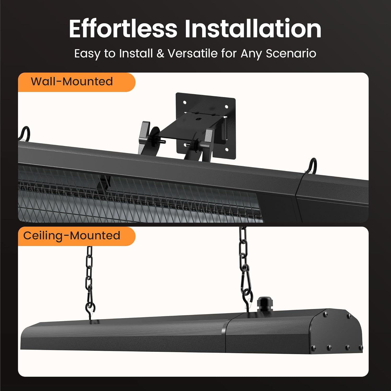 - POWERFUL HEATING FOR INSTANT COMFORT: Patio heater experiences powerful 1500W heating capacity with advanced graphene technology. The outdoor heater heats up instantly in just 0.5 seconds, electric patio heater delivering warmth up to 12 feet. Perfect for quick relief from the cold, infrared electric heater ensures your comfort in no time—no waiting, no shivering, just immediate, efficient warmth! This makes it an ideal infrared outdoor electric space heater—fast and powerful heating. VERSATILE INSTALLATION FOR ANY OUTDOOR SPACE: Wall-mounted heater lets you enjoy flexible installation with two mounting options—hang it from the ceiling for wide coverage or mount it on the wall for targeted heating, making it perfect for any outdoor space. Its hassle-free assembly requires just 3 simple steps, with most components pre-installed for quick setup. Suitable for various settings like gazebos, patios, or even as a garage heater, it adapts to your needs for both style and functionality. CUSTOMIZED HEATING EXPERIENCE AT YOUR FINGERTIPS: The 36-hour timer function, 4 adjustable heat levels, and memory function allow you to customize your heating experience. You can set the time and heat level according to your preferences. The outdoor space heater turns off automatically when the time is up, and the next time you start it, the patio heaters for outdoor use will automatically adjust back to the last heat level used. Enjoy a personalized heating experience tailored to your liking. SAFETY-FIRST DESIGN FOR OUTDOOR COMFORT: Designed with a modern aesthetic and your safety in mind, this radiant heater features overheating and tip-over protection, automatically shutting off power in risky situations to keep you and your family safe. These outdoor heaters for patio provide the ideal heating solution for a gazebo, balcony, BBQ area, or as an infrared heater. Its design and safety features make it perfect for outdoor comfort and peace of mind. MAXIMUM POWER OF 1500W: Due to the standard 110V US electrical outlet, the heater operates at a maximum power of 1,500W. In extremely cold weather conditions, the heater may have limited ability to warm the surrounding outdoor area effectively. Ideal for moderate to chilly climates for optimal performance
