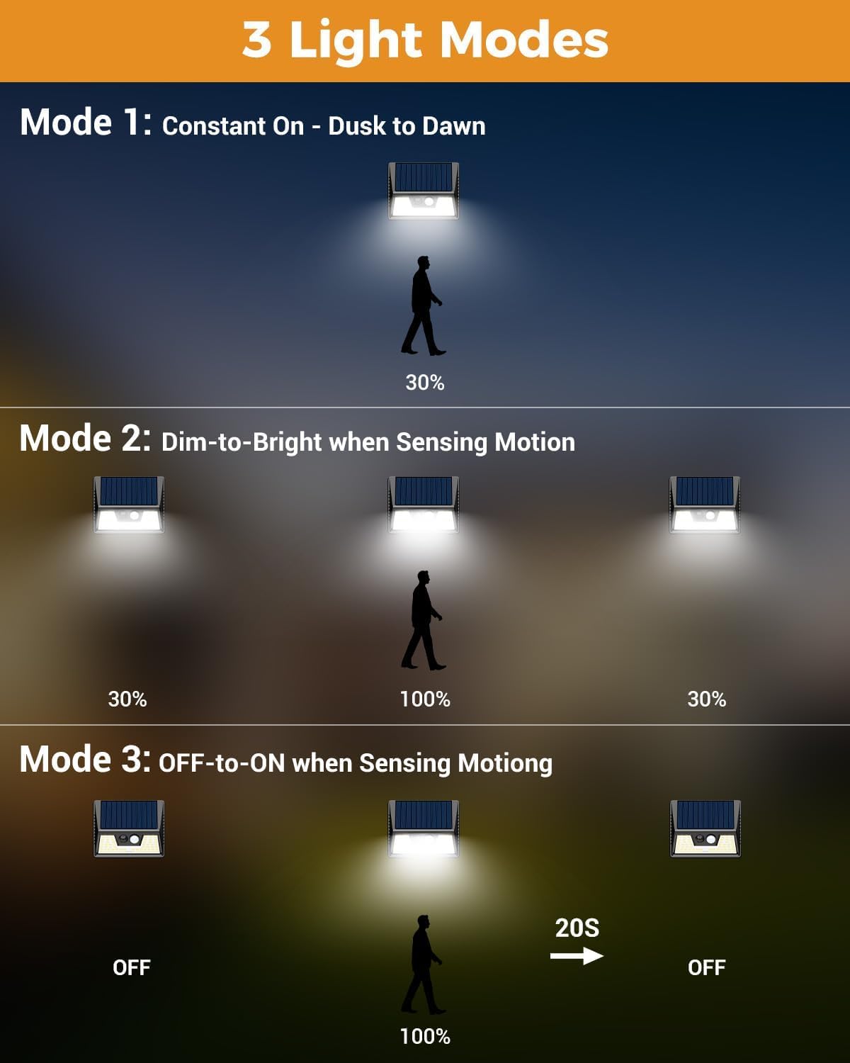 - 【Smart PIR Motion Inductor】: vighep solar lights outdoor offer 3 lighting modes for versatile functionality. 1. Motion Sensor Mode: Lights turn on when people approach, ensuring safety and convenience. 2. Permanent On Mode: Lights stay illuminated all night for continuous visibility. 3. Smart Brightness Control: Lights stay on all night and automatically brighten when motion is detected, optimizing energy efficiency and enhancing security