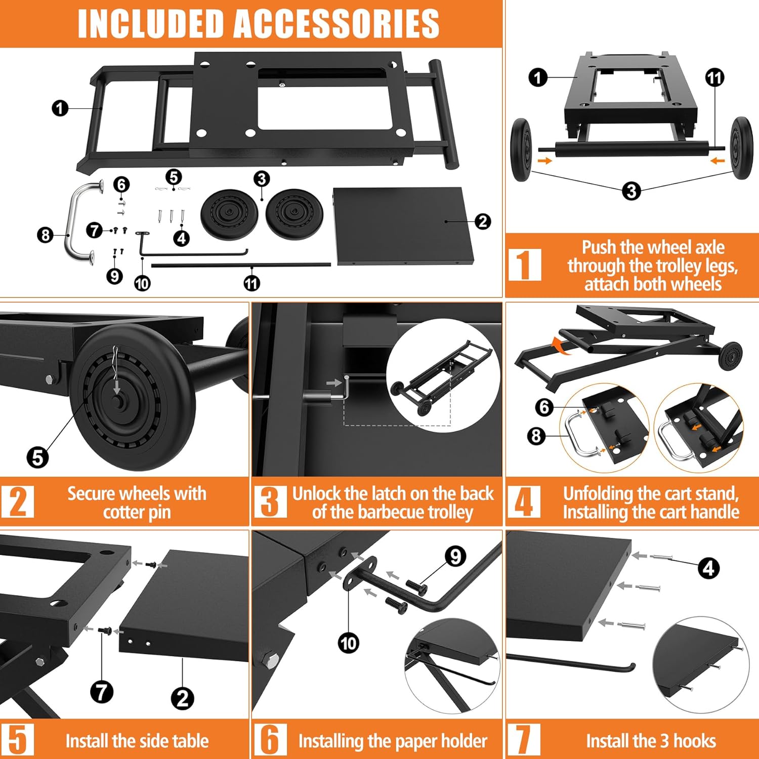 - UNIQUE AND CONSIDERATE DESIGN: The dimensions of this metal table is 35" x 18.5" x 30". This universal grill stand is large enough to hold a variety of cooking tools with the included side removable shelves. Easy folding design for mobility and compact storage. Plus, the dining cart table comes with cooking tool hooks and side handles. This metal cart on wheels allows you to move this table easily, So you can enjoy a patio BBQ or outdoor camping