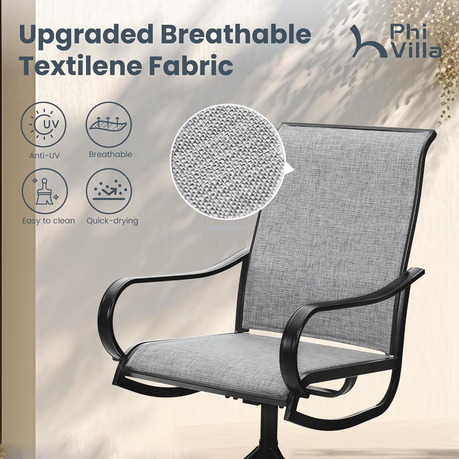 - Premium Textilene Seat and Back: The chair seat and back use high density textilene mesh fabric mixed with olefin which not only comfortable but breathable, easy-to clean and long-lasting for all weather. And The curved backrest design complies with ergonomic standard providing a better sitting experience
