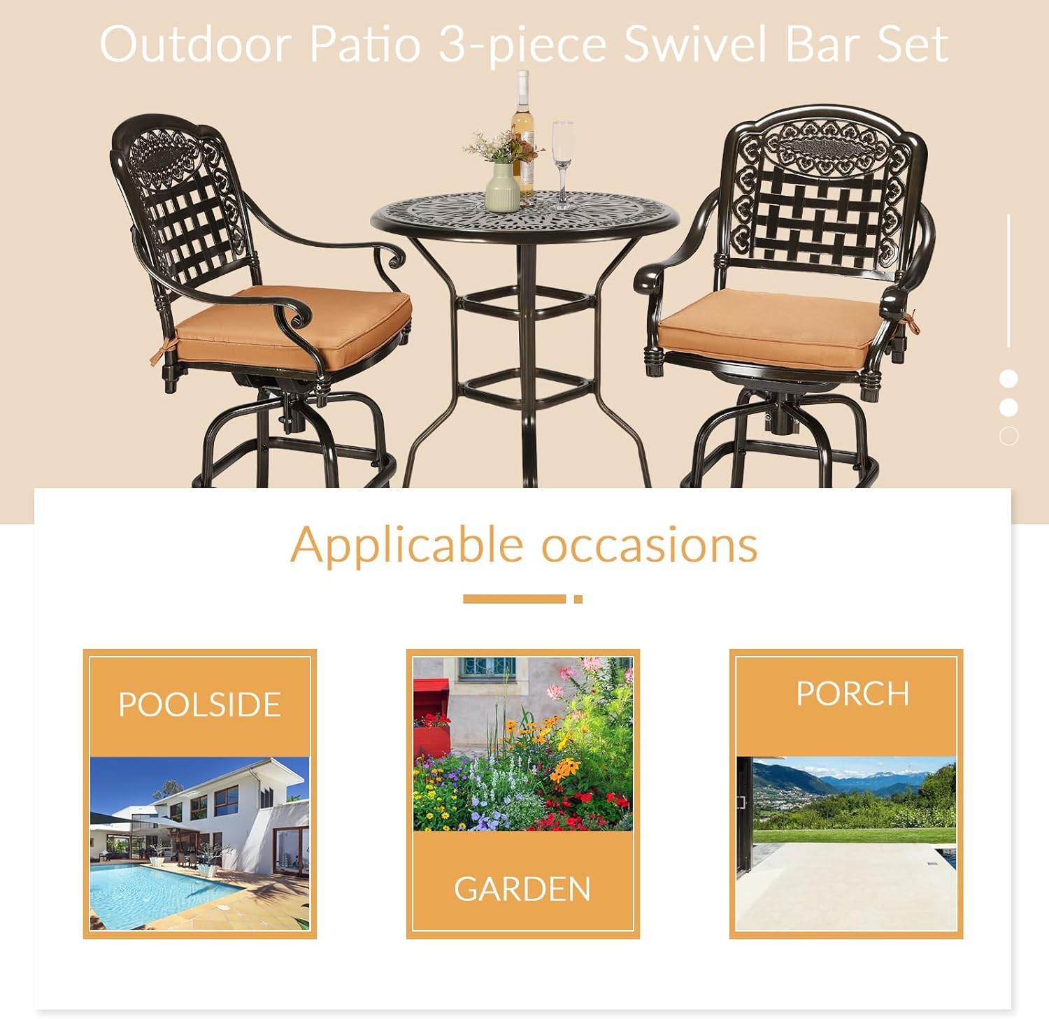 3-Piece Patio Swivel Bar Set, High Top Bar Table & Chairs, All-Weather Cast Aluminum Swivel Bar Stools (2) & 35.4" Table, Patio Bistro Set for Garden
