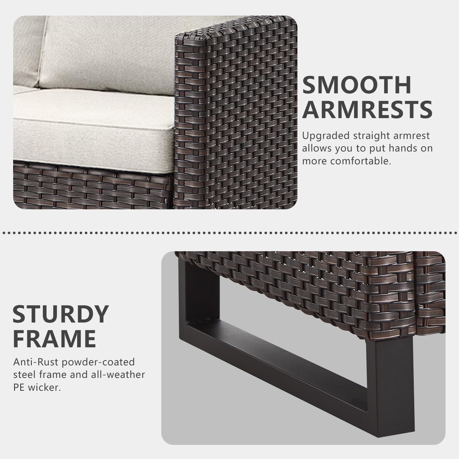- 【Sturdy&Durable】Crafted with interior Anti-Rust powder-coated steel frame and wrapped in All-weather Hand-Woven PE wicker that make this sectional sofa set sturdy and durable,UV and Weather resistant,The upgrated rectangle feet of couch and table which add more stability.