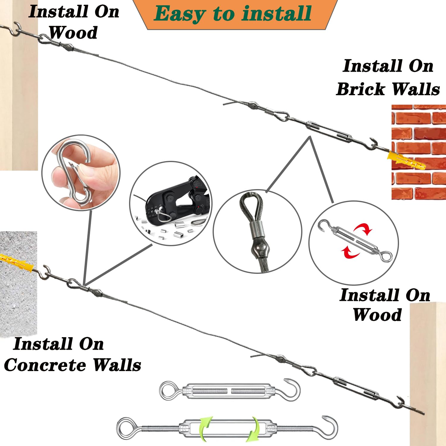 - 【Wide Application】:This 1/8 stainless steel cable Kit is versatile and flexible. It is suitable for backyard café lights, yard lights, party lights, curtains, clothes, support climbing plants and shade sails,It can also weddings, birthdays, or Christmas Outdoor decoration and String Lights Hanging