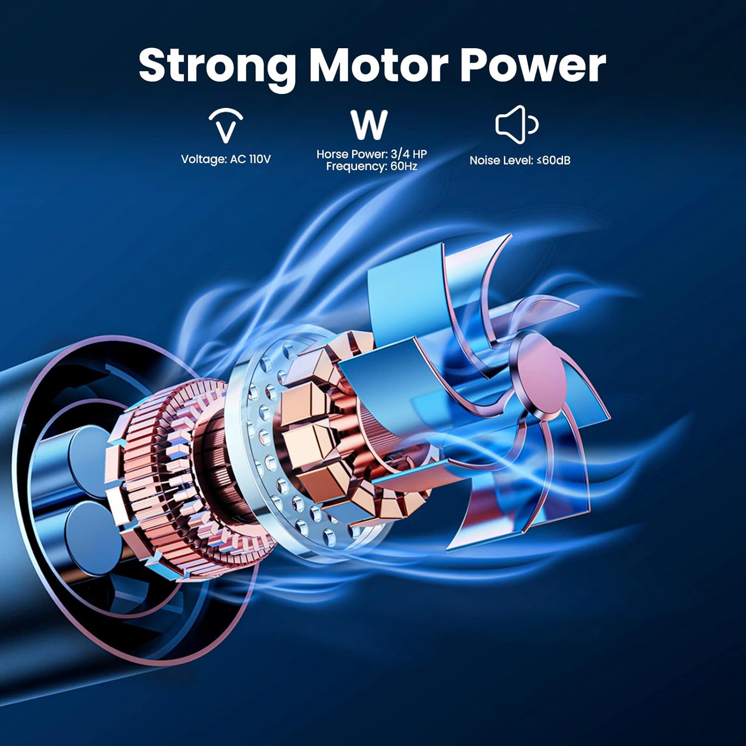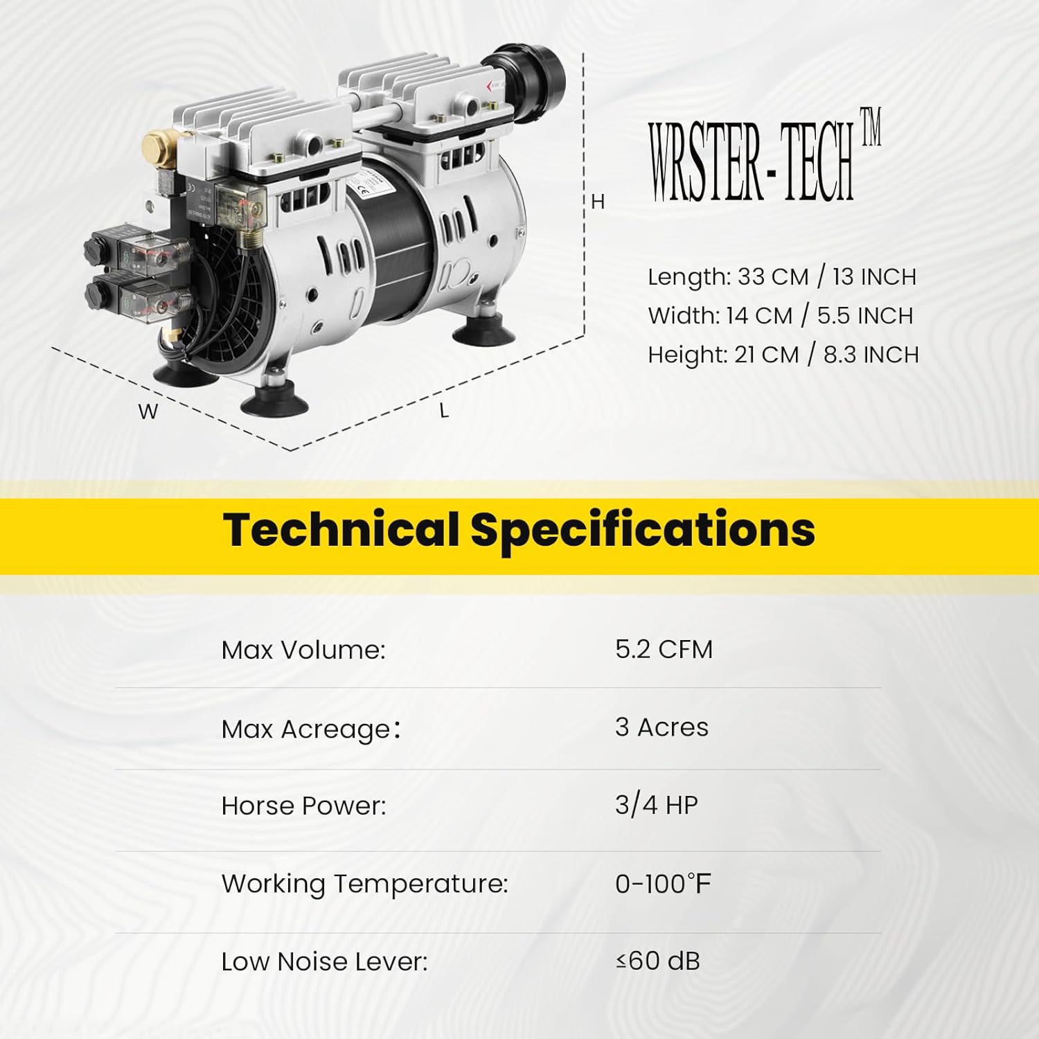 - 3/4 HP Air Compressor β Highly efficient and quiet 3/4 HP oil-free Rocking Piston Air Pump, with maximum 5.2 CFM air volume and below 60DB low noise level, strong power to promote the underwater oxygen circulation.