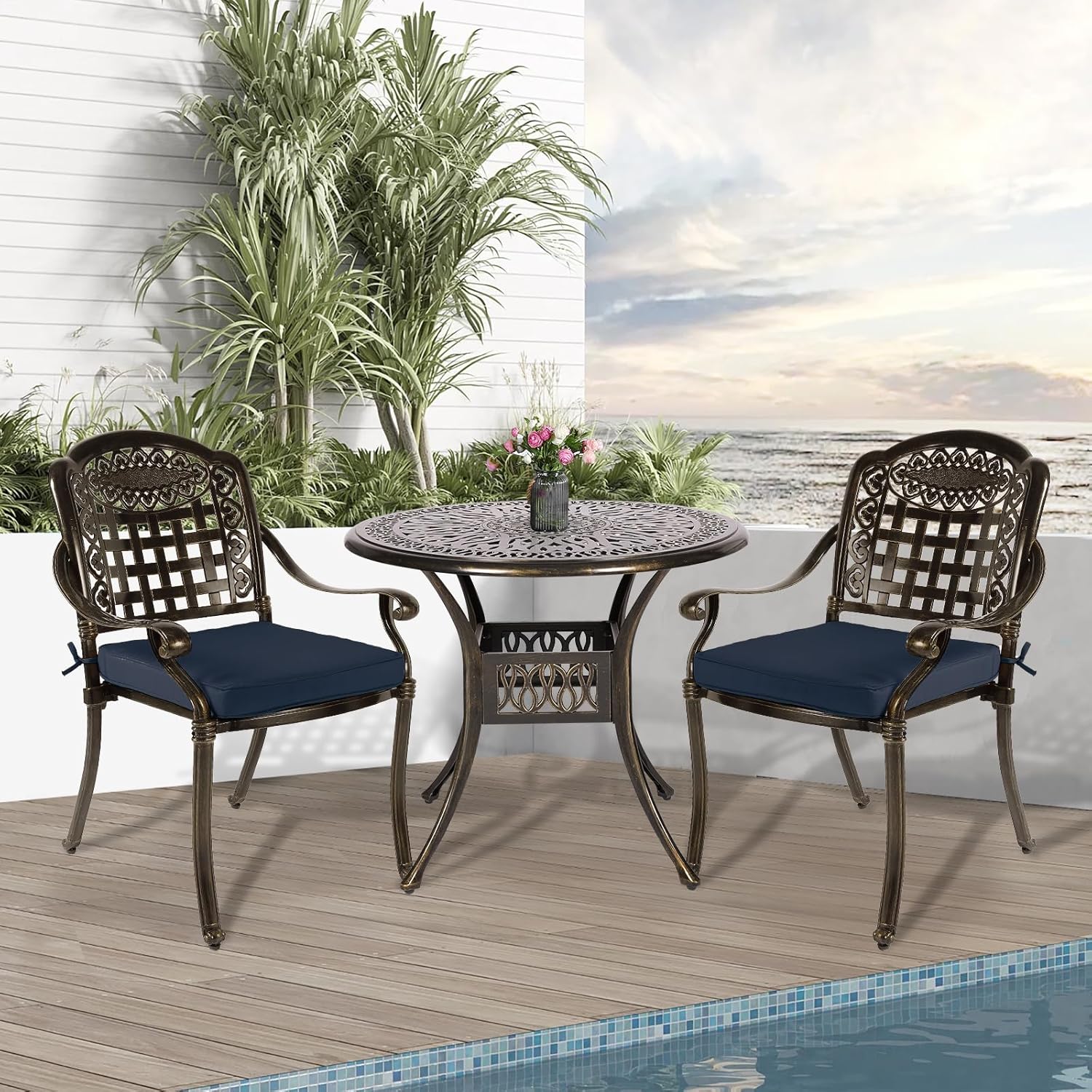 3-Piece Outdoor Patio Dining Set, All-Weather Cast Aluminum Patio Furniture Set for Backyard Garden Deck with 2 Cushioned Chairs and 35.4” Round Table, 2" Umbrella Hole, Navy Blue