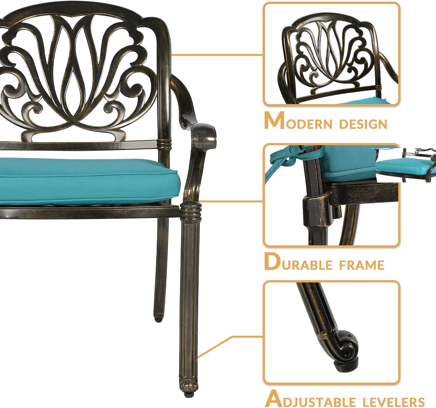 - 【Considerate Design】 - Each leg of this patio chair is equipped with adjustable levelers for non-flat surface. The curved backrest of the chair fits your back, wide seats allow you to sit comfortably, curved armrests allow you to place your arms naturally to get rid of the fatigue of the day and make your leisure time more enjoyable.