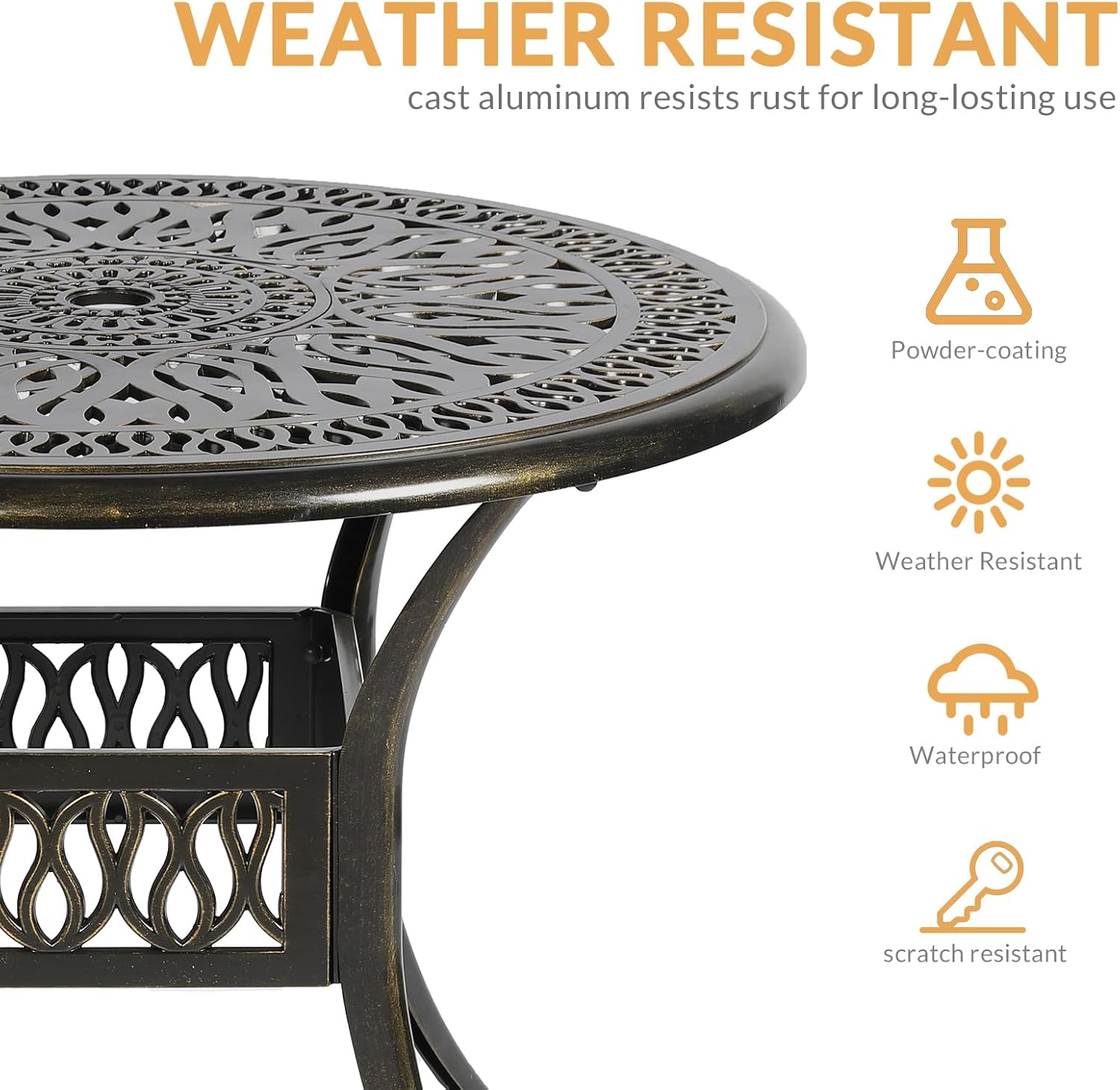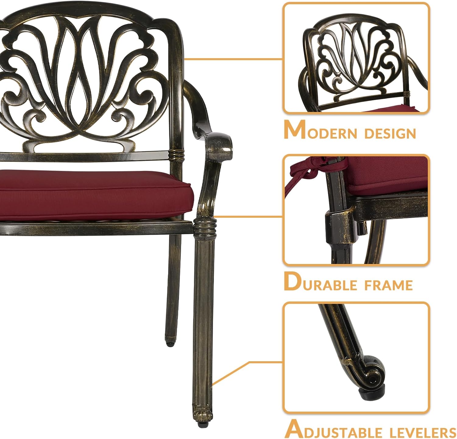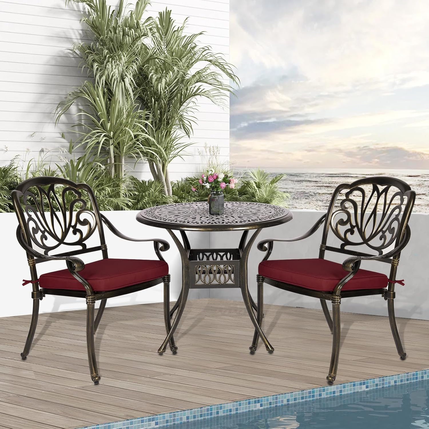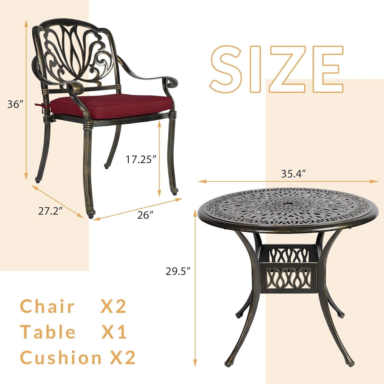 - 【Durable 3-Piece Dining Set】 - Made from cast aluminum for long-term durability. Resistant to rust, weather, fade, crack. This patio set includes 1 round table, 2 chairs, 2 cushions, and they stay in perfect condition regardless of the weather. It's also easier than ever to clean, just use a dry or damp rag to wipe down.