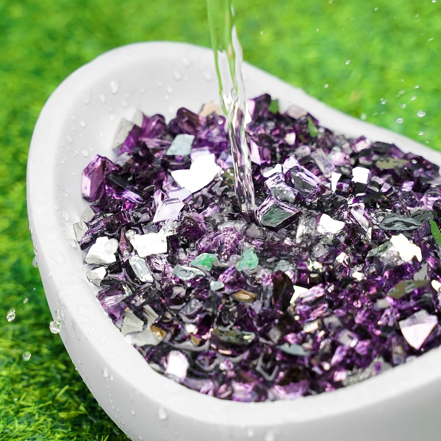 - 【Reflective Tempered Glass Shining In The Fire】- The broken purple fire glass backed by a highly reflective mirrored backing that gives off a beautiful metallic, It shines in the daytime and appears multicolored at night with fire.