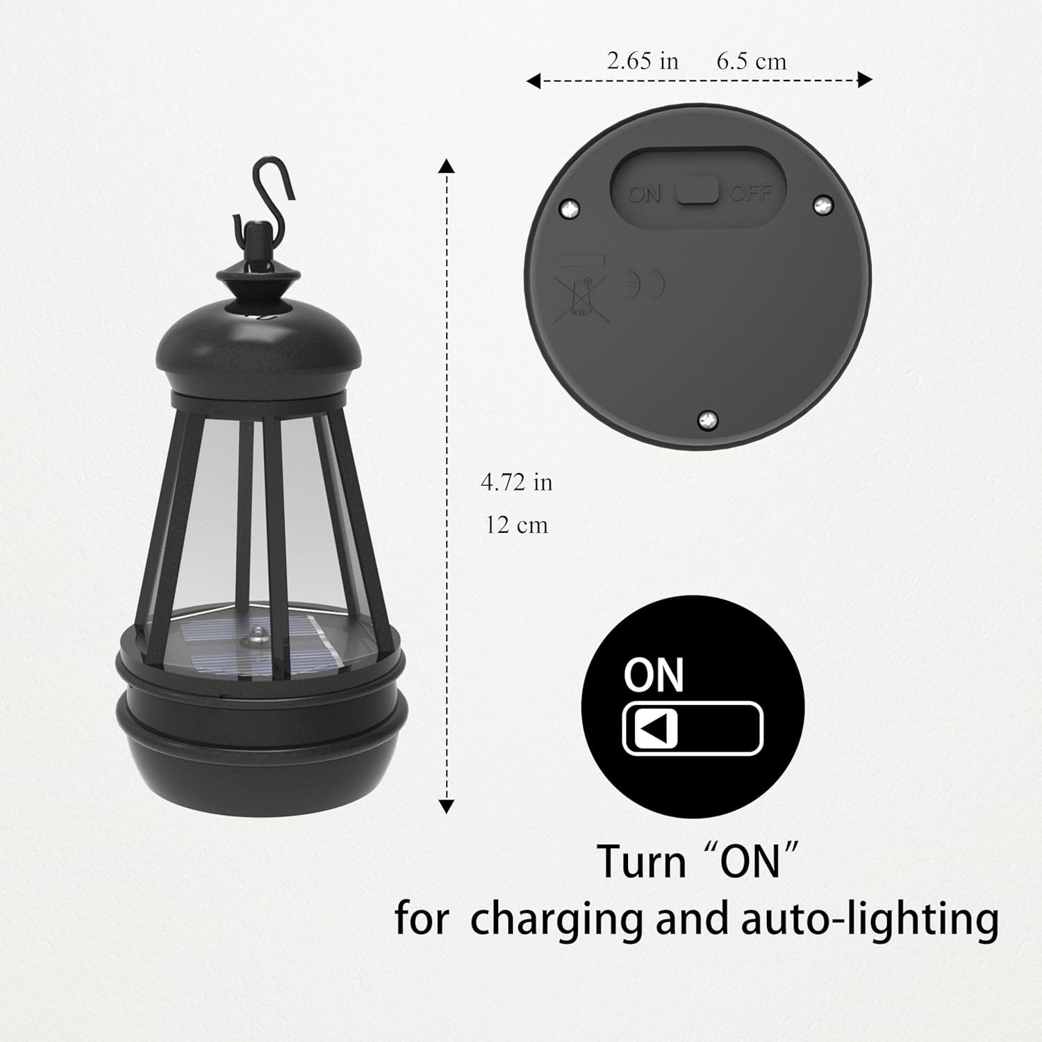 - Portable Size & Solar charging: 8.7"Γ3.1"Γ9.5". For the first use, turn the switch to βONβ, simply leave it charging in the sun (in case the energy runs out after a long period of time out of the sun during transportation), and it will automatically light up at dusk.