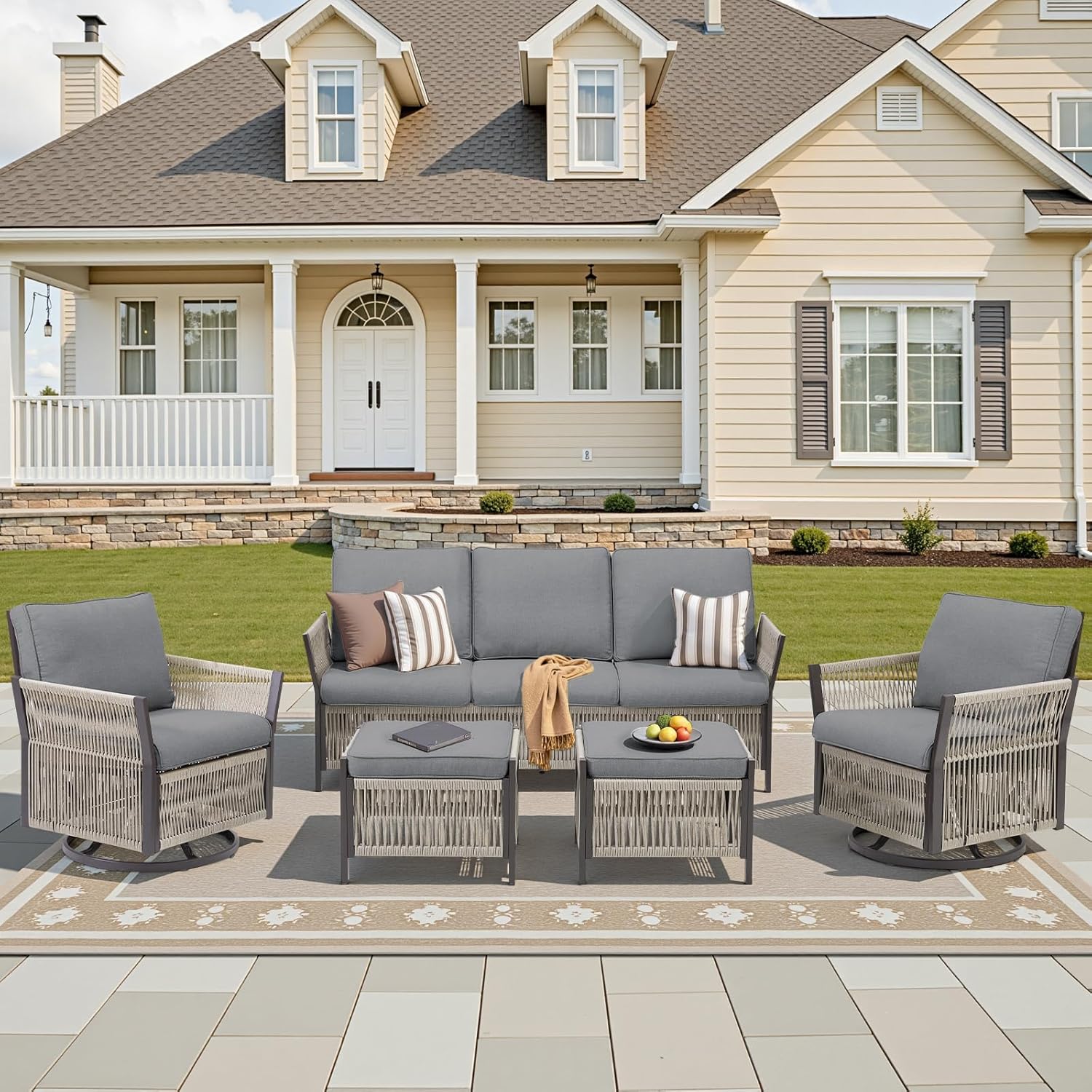 Patio Furniture Wicker Outdoor Conversation Set, 5-Piece All Weather Patio Furniture Rattan Rocking Sets w/Removable Cushions & Ottomans for Backyard, Balcony, Deck, Dark Grey