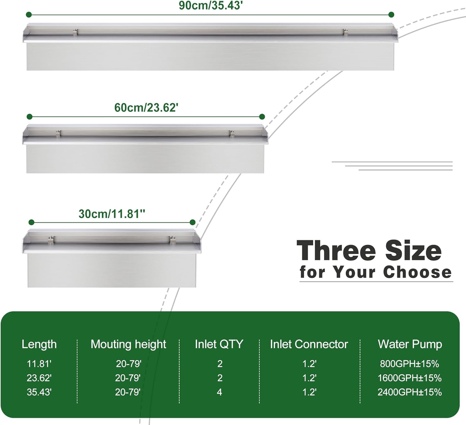 - ăAnti-Rust Spillway Waterfallă- The main body of this stainless steel spillway waterfall is welded together using 304 stainless steel for stable long-term use, featuring an top open lip design that creates elegant, invigorating, freefalling water effects to add a decorative touch to ponds and pools, letting you enjoy the relaxing sounds of water for a sense of calm and well-being. LED light strips not included, but available separately.