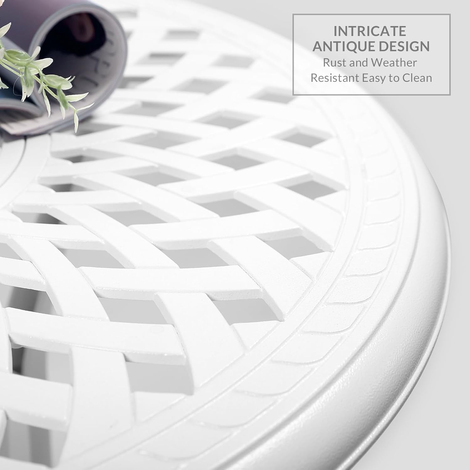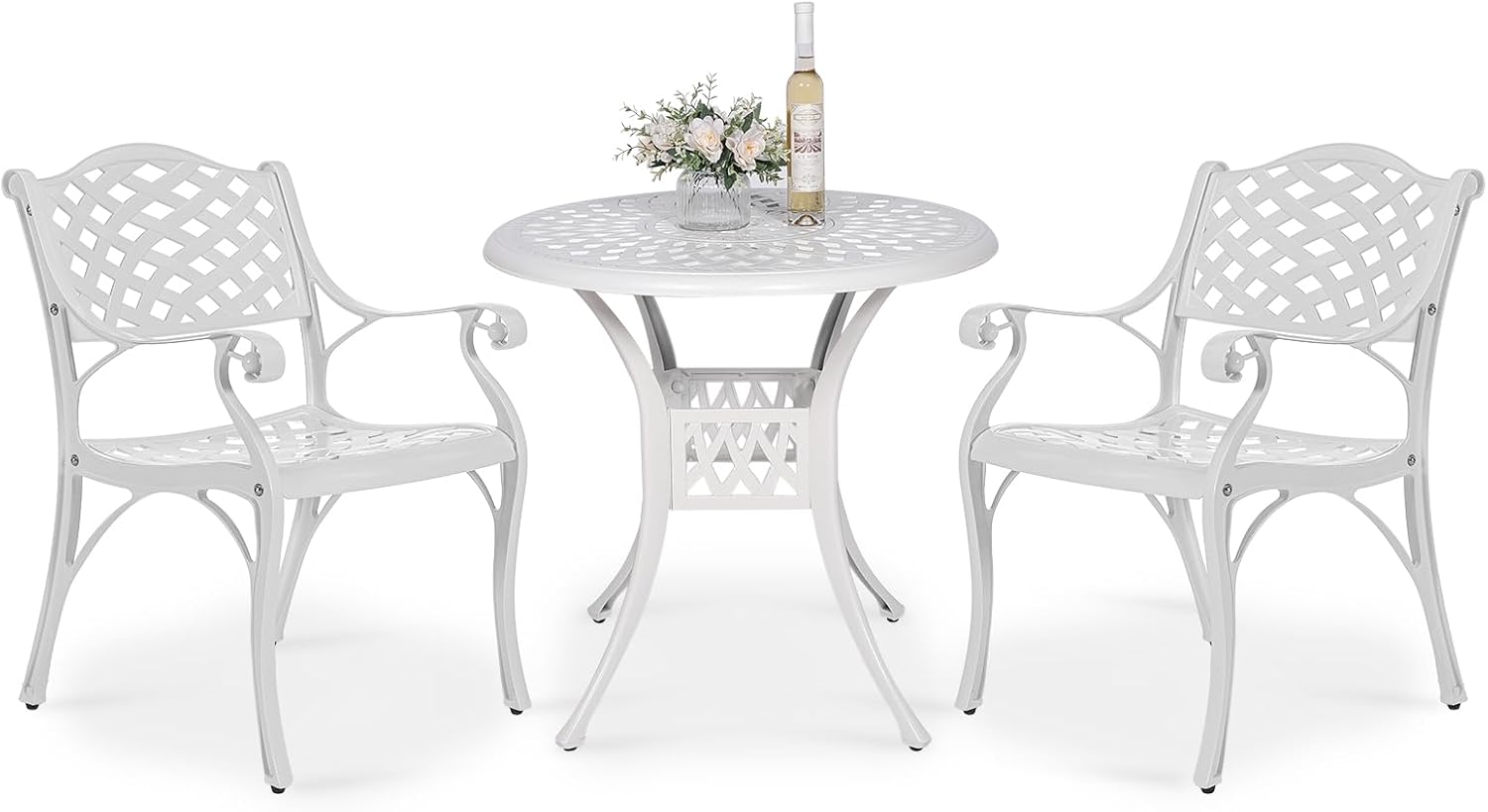 - 【3-PIECE SET】Elevate your outdoor living space with this exquisite Patio Dining Set, featuring two dining chairs and a round table, all finished in a crisp and timeless white. The intricate lattice design adds a touch of sophistication, making this set not just functional but a statement piece for your patio, balcony, or garden.
