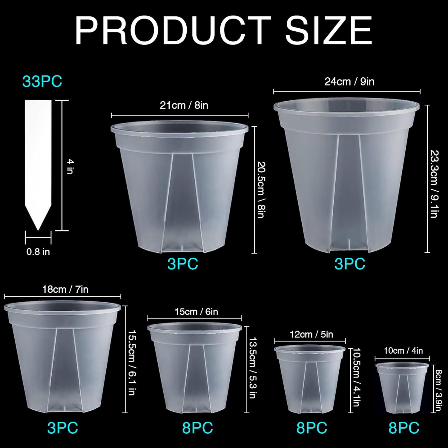- Complete Gardening Set Includes 33 frosted clear pots in 6 sizes (4/5/6/7/8/9 inch) plus 33 white PVC plant labels for easy plant identification