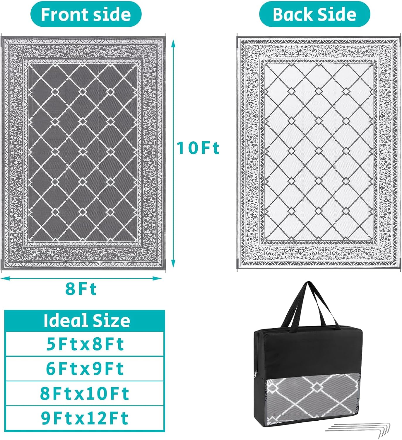 - Reversible Outdoor Rugs: Featuring a classic moroccan pattern on both sides, this 8x10 ft outdoor area rug allows you to instantly refresh your patio, porch, backyard, deck, RV campsite. And this outdoor deck rug is reversible, two-sided design allows you to have two different looks,both sides can blend perfectly with nature and look very full and comfortable.