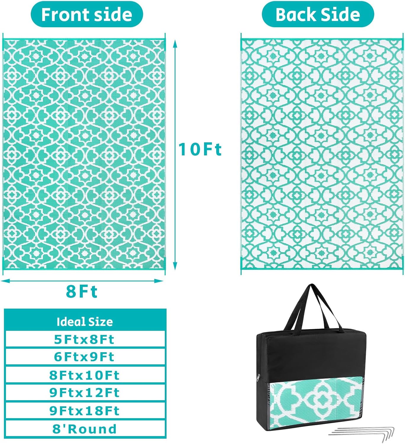 • Versatile Outdoor Carpet: The indoor outdoor plastic rugs have multiple choice in different colors(4'x6',5'x8',6'x9',8'x10',9'x12',9'x18',8'round), is ideal for a variety of indoor outdoor activities,like patio mat, deck rug, garden rug, beach mat, picnic mat, BBQ party mat, rv camping rug,pool rug,outdoor doormat,garage rug,front door mat,allowing you to have plenty of imaginable space for more fun.