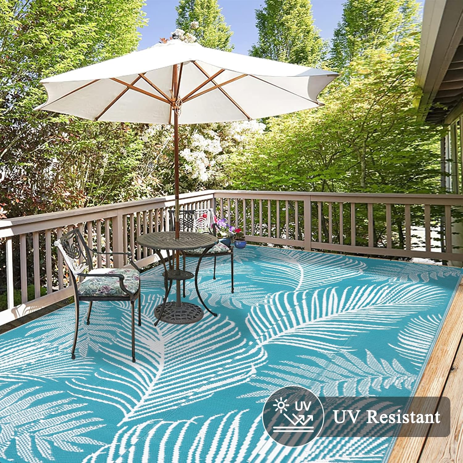 Pauwer Waterproof Outdoor Rug 9x12, Reversible Plastic Straw Patio Camping Rug, Indoor Outdoor RV Mat Carpet for Deck, Camper, Porch, Balcony, Backyard, Picnic, Leaf Teal