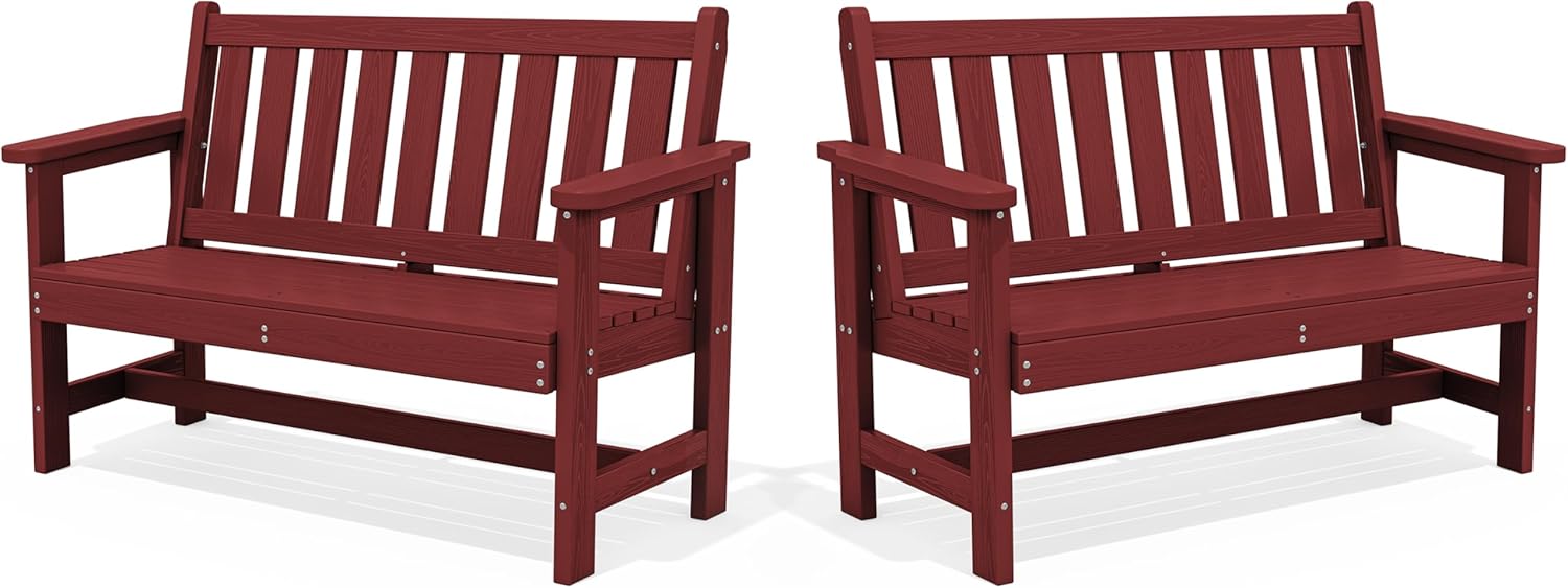 SERWALL Outdoor Bench, HDPE Outdoor Benches Weatherproof, 2-Person Garden Bench with 660 lbs Weight Capacity, Patio Benches for Outdoors, Garden, Porch, Backyard and Park, Red, 2 Pack