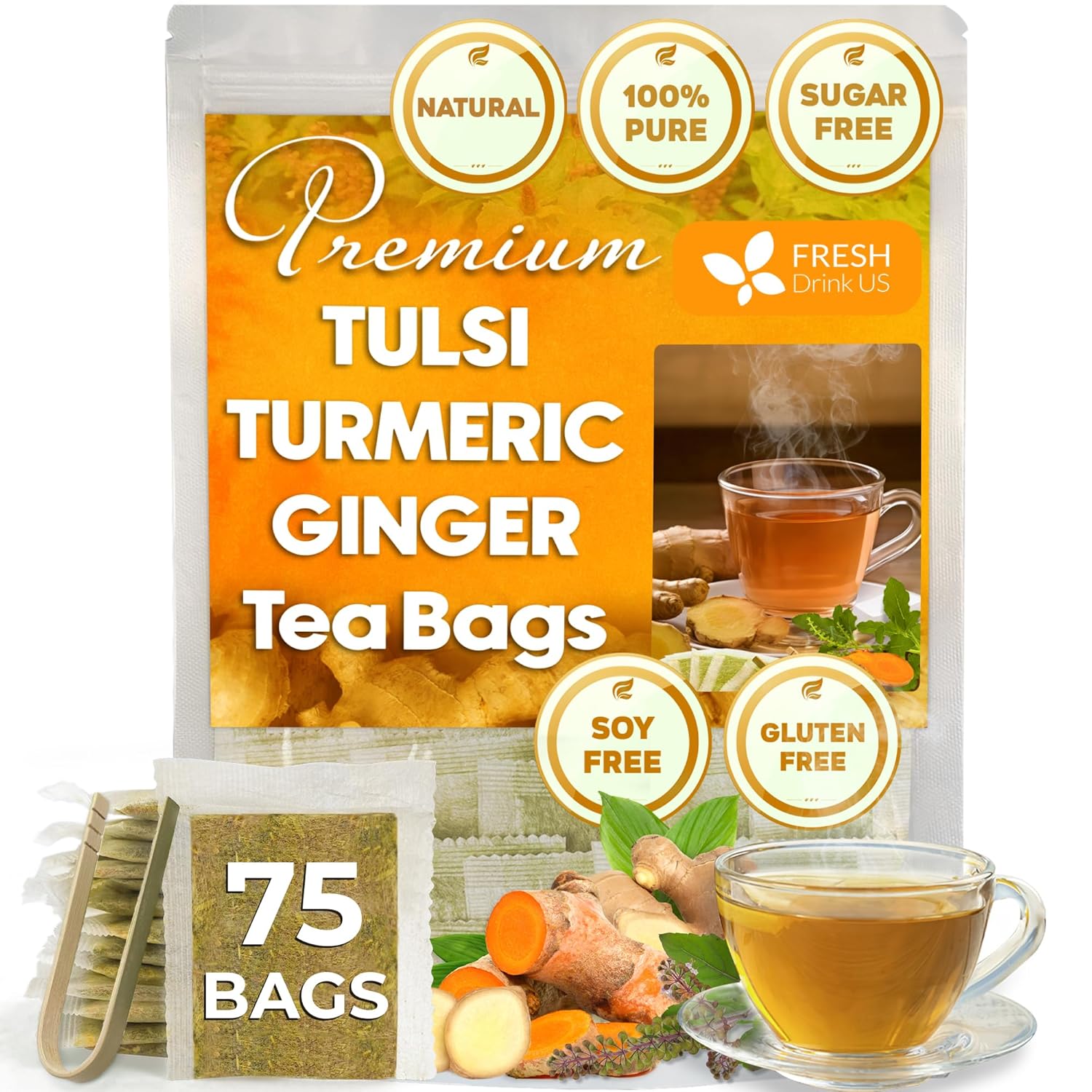 FreshDrinkUS, Premium 75 Tulsi Turmeric Ginger Tea Bags, 100% Natural & Pure from Tulsi Holy Basil Leaves, Turmeric and Ginger. Made with Natural Material Tea Bags. No Sugar, No Caffeine, Vegan.