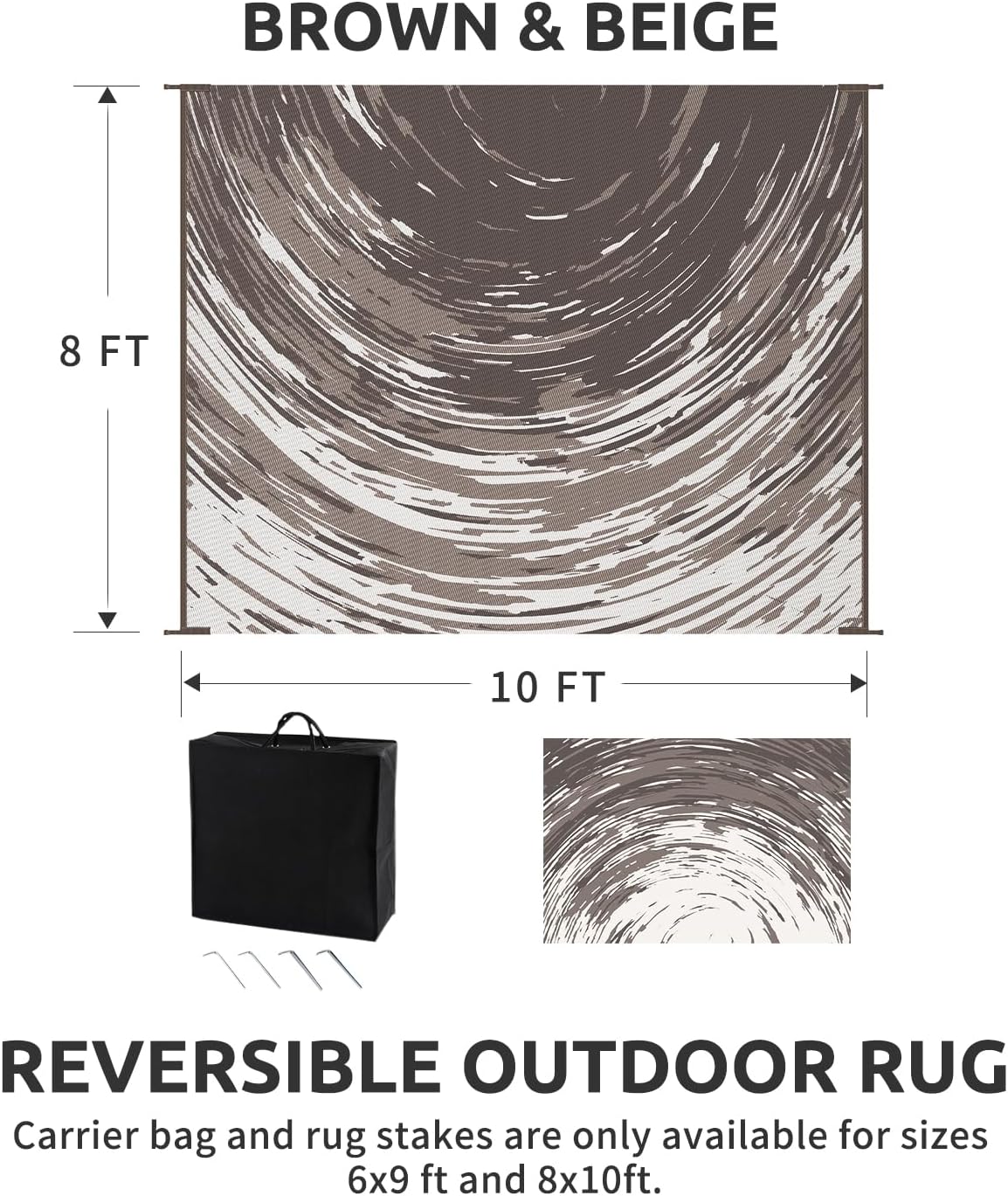 - RV traval&Camping: This camper must haves outdoor rug is ideal for picnics, gatherings, and RV trips! The lightweight outdoor camping carpet with foldable lines is easy to carry and saves space. Includes an extra carry bag and rug stakes for 6x9 ft, 8x10 ft and 9x12 ft. Grass-friendly, durable, and easy to clean, this outdoor rug enhances outdoor adventures.