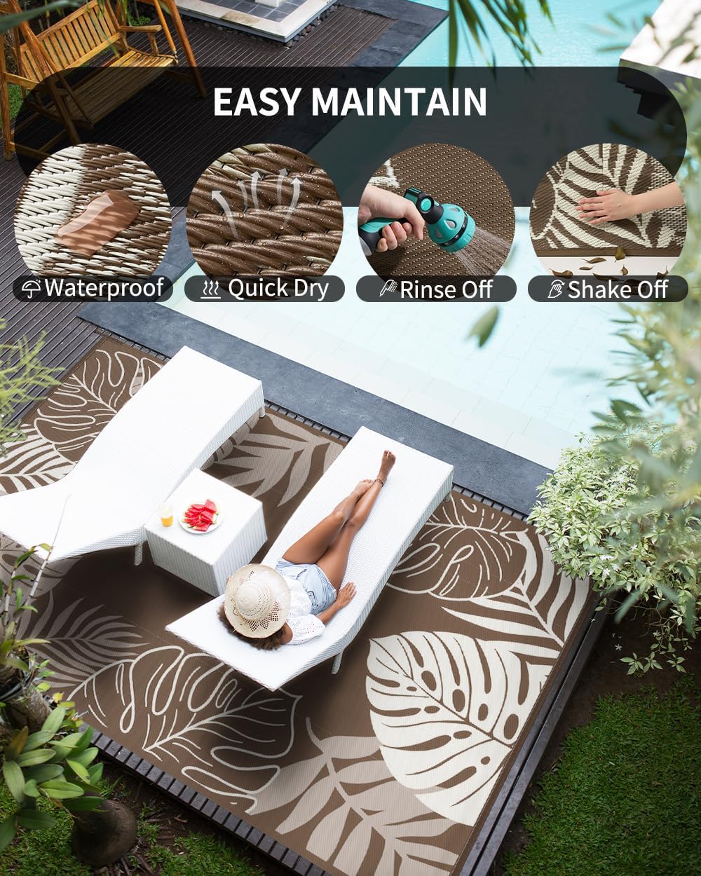 - Easy Clean&Quick Dry: Tightly woven patio rug designed to resist stains from beverages and food. Dirt and leaves can be easily wiped off or hosed down. Outdoor rug waterproof ensure quick drying, keeping your outdoor deck dry and free from unpleasant marks. This excellent outdoor patio rug allows you to spend more time enjoying life.