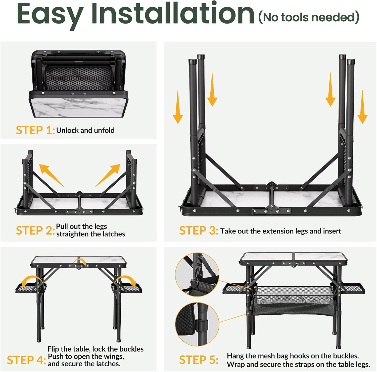- Lightweight & Strong Load-bearing. Our folding camping table is made of 90% aluminum & 10% density board, ensuring that it is light and strong at the same time. The picnic table is 6lbs heavy and the tabletop supports up to 70 lbs. Each wing supports up to 20 lbs and the storage bag can hold lightweight items not more than 11lbs for long-term use.