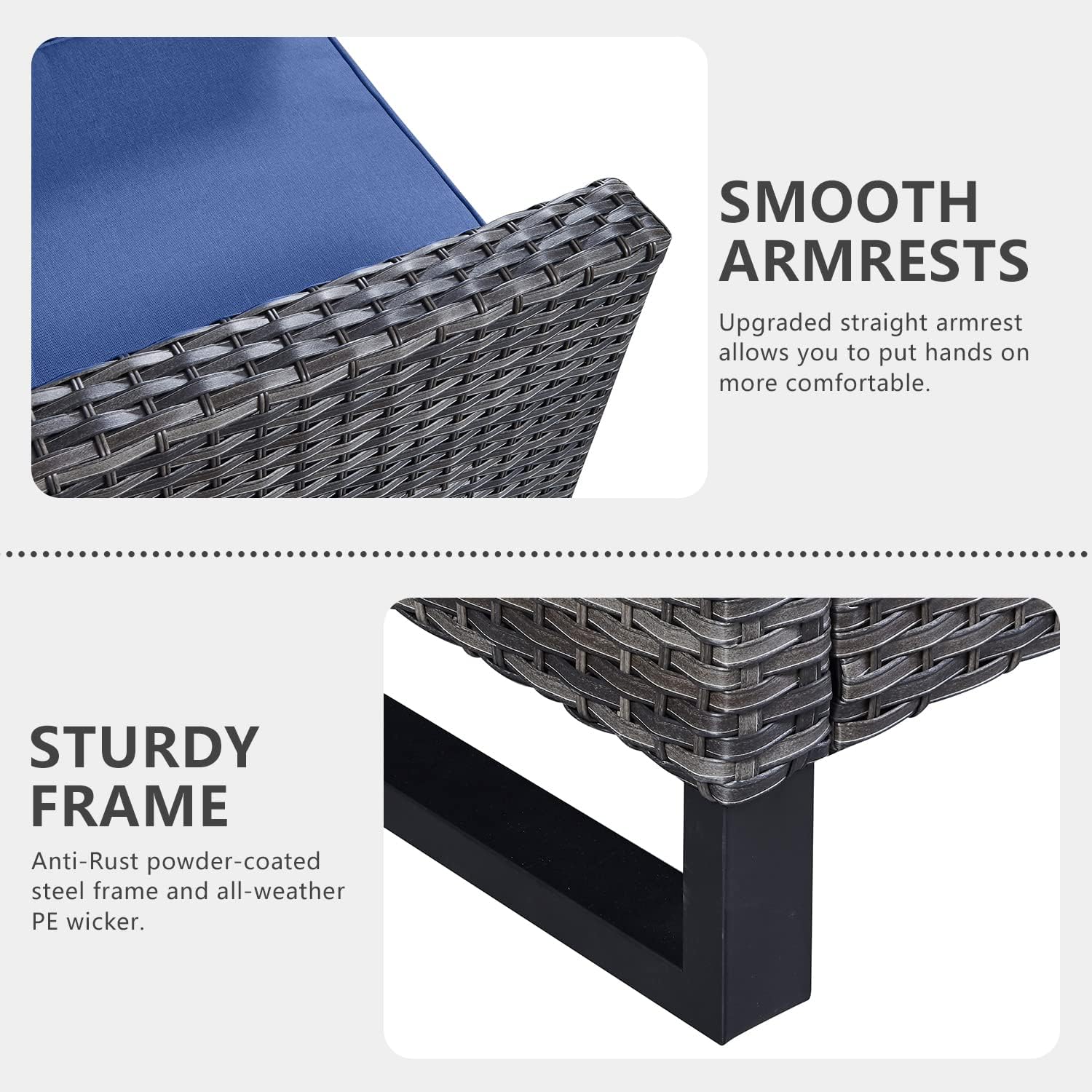 - 【Upgrated Elegant Design】All made with Anti-Rust powder-coated steel frame and All-weather Hand-Woven PE wicker to make this patio furniture set is resistant to UV and weather,The patio conversation sets is totally upgraded with straight armrest and the heightened ergonomically curved backrest.