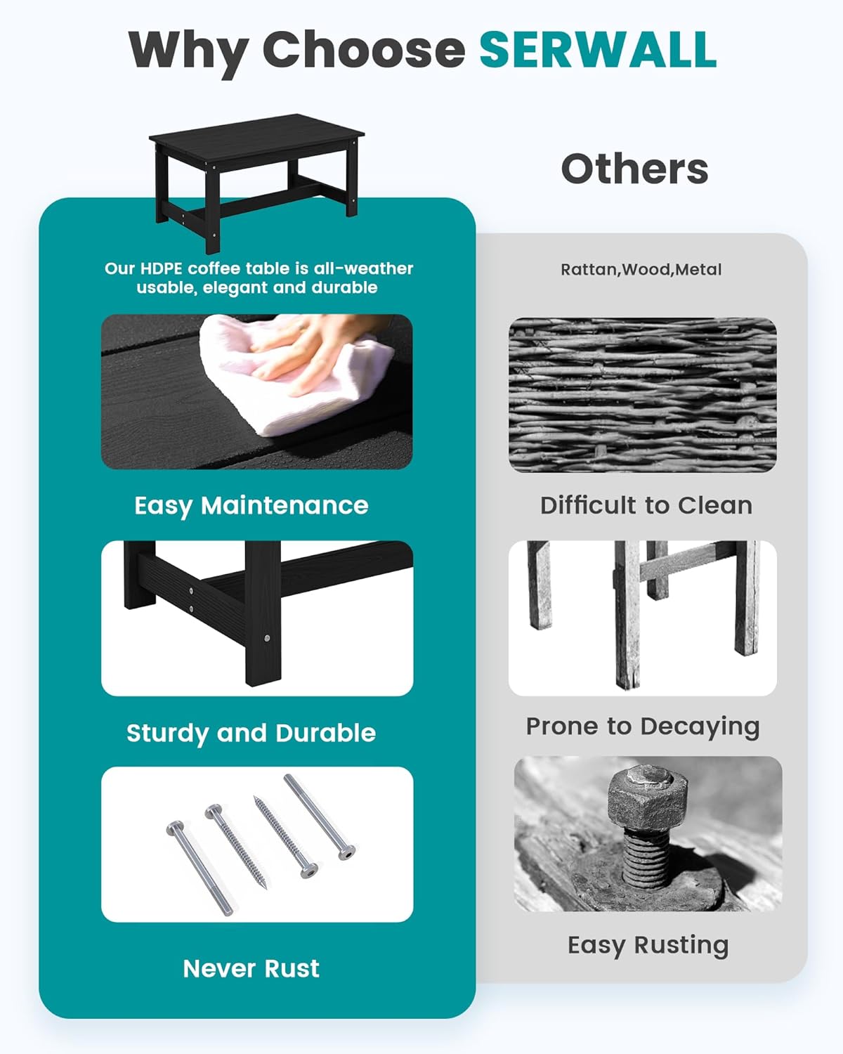 SERWALL HDPE Outdoor Coffee Table, All-Weather Patio Coffee Table, Rectangle Adirondack Outdoor Table Fits with Outdoor Sectional Couch for Outside Deck Porch Lawn, 37.8" x 22.8", Black